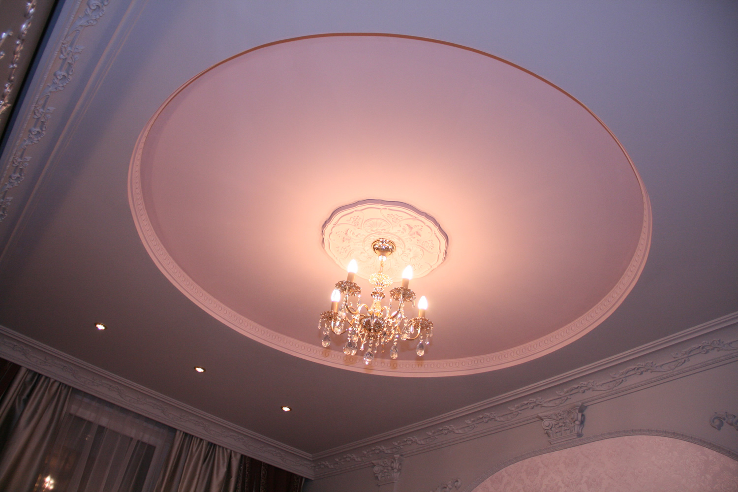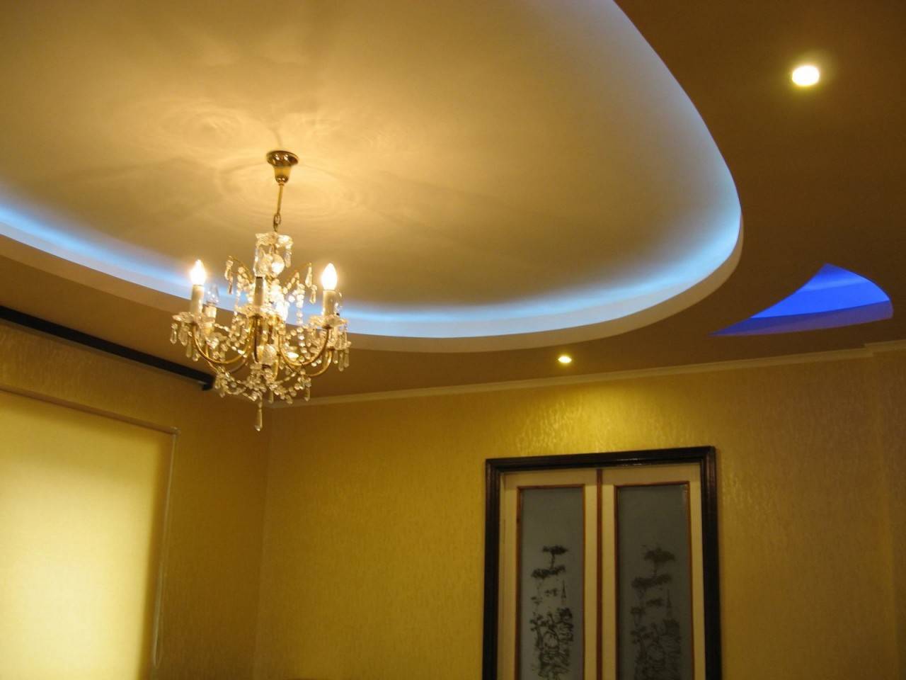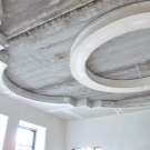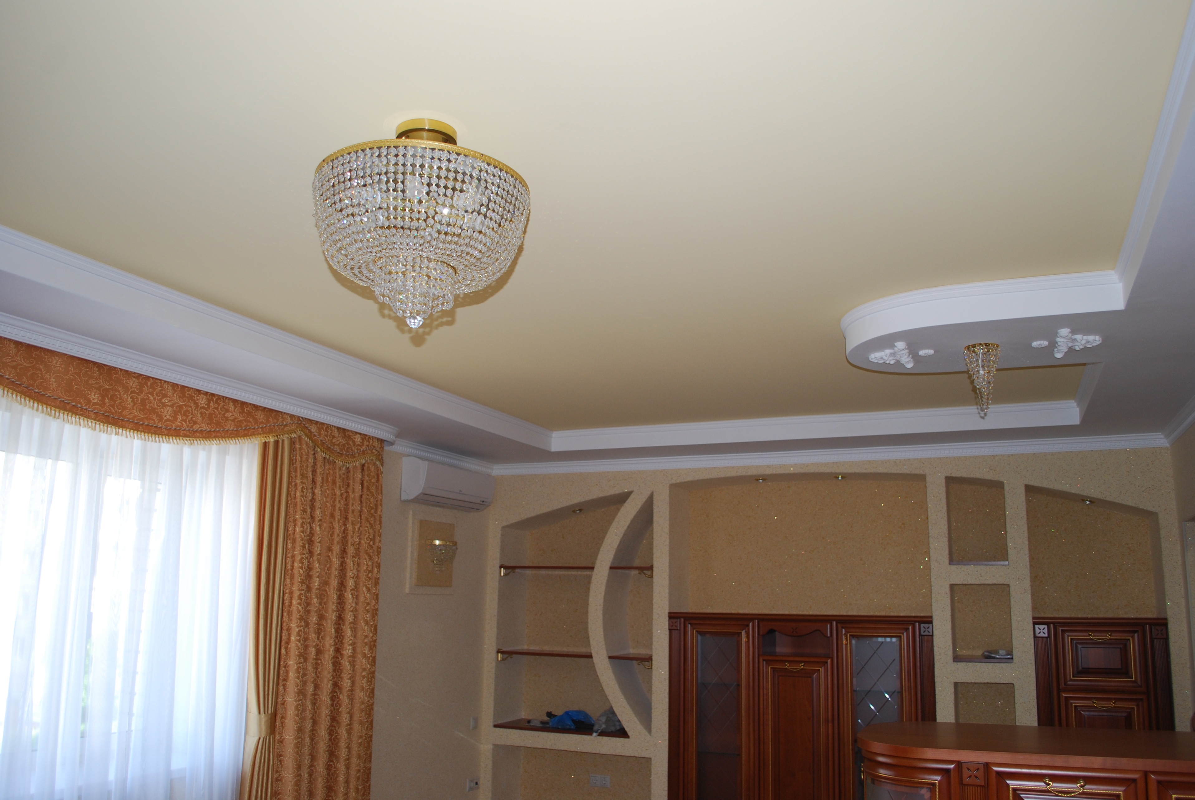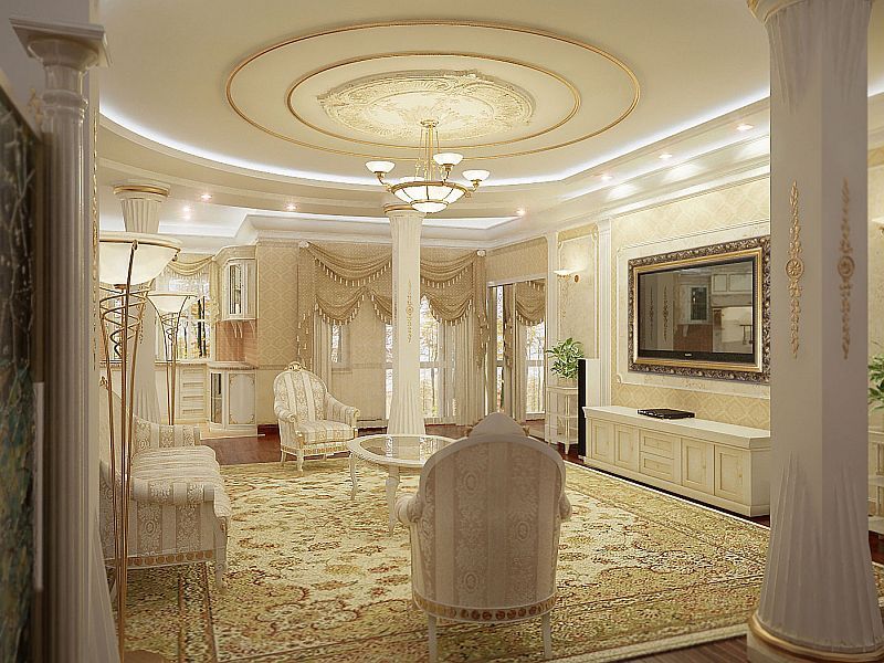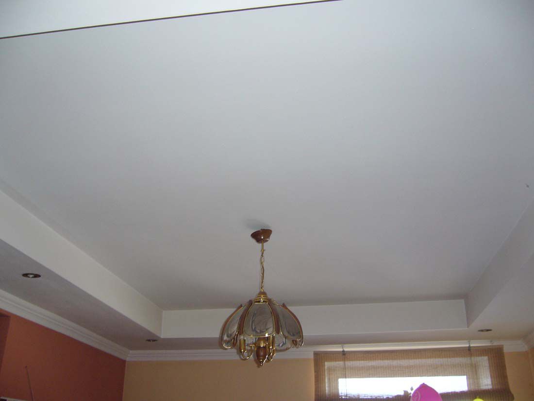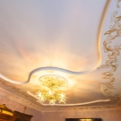 Zweistöckige Decke ist eine gute Tradition, die auch in den königlichen Speisesälen beliebt war. Erinnere dich wenigstens an eine luxuriöse Decke in der Halle von Peterhof! Ein wichtiger Vorteil dieser Konstruktion ist, dass sie die Unzulänglichkeiten von Putz oder Mauerwerk, geschlossenen Decken, Drähten, Balken usw. leicht verbergen kann.
