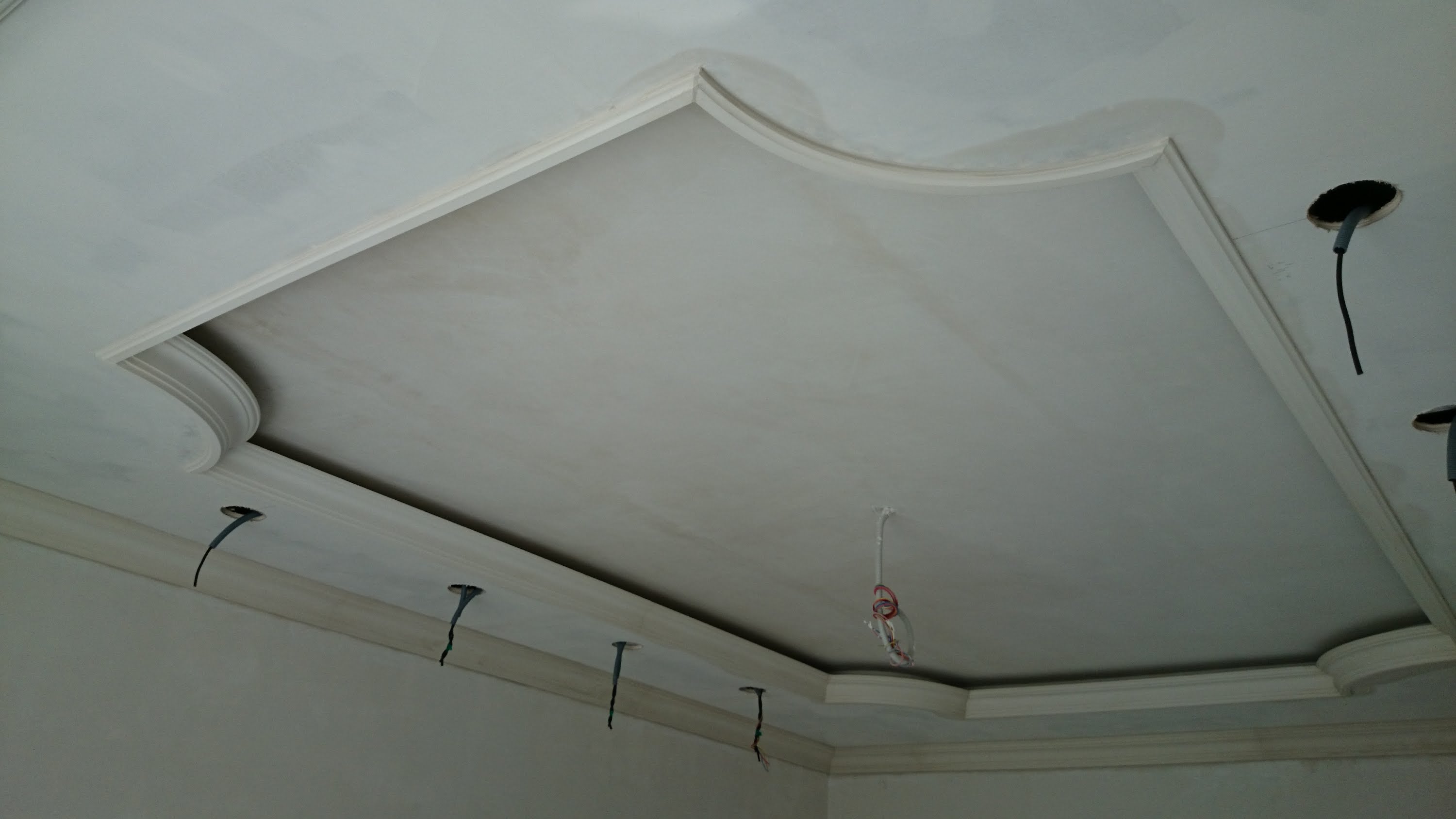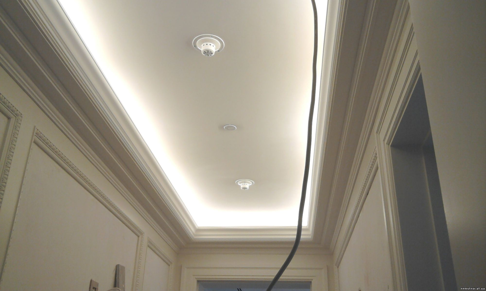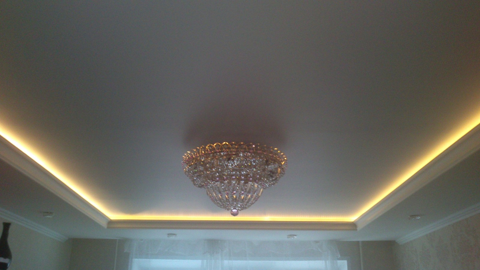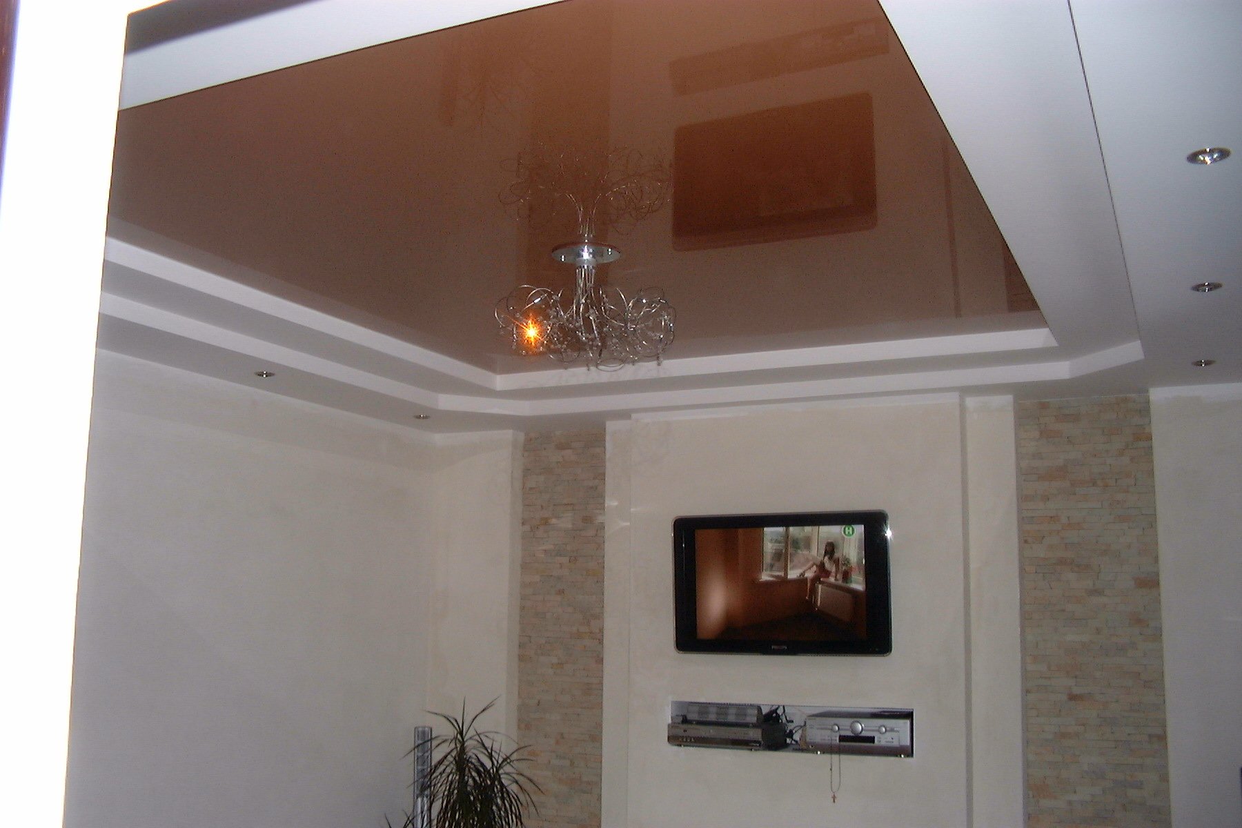 Zweistöckige Decke ist eine gute Tradition, die auch in den königlichen Speisesälen beliebt war. Erinnere dich wenigstens an eine luxuriöse Decke in der Halle von Peterhof! Ein wichtiger Vorteil dieser Konstruktion ist, dass sie die Unzulänglichkeiten von Putz oder Mauerwerk, geschlossenen Decken, Drähten, Balken usw. leicht verbergen kann.