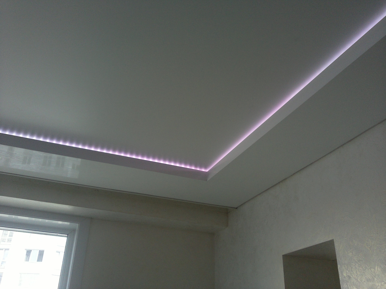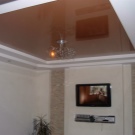 Unter Spanndecken sind glatte, glänzende Oberflächen am üblichsten. Auch teuer aussehen Modell mit einer samtigen, matten, satinierten Textur, kombiniert mit der richtigen Beleuchtung. Dank ihnen können Sie den lang ersehnten Komfort auch auf den bescheidensten Quadratmetern erreichen.