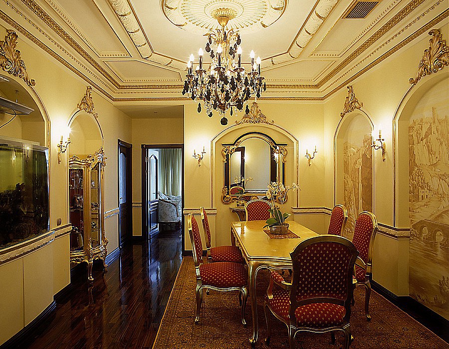 Original in der Küche sieht ungewöhnlich aus, eine seltene Version des Designs des edlen Steins. Machen Sie es zu einem interessanten Styling, und eine künstlerische "Kuppel" wird über Ihrem Kopf erscheinen, von der es schwierig sein wird, Ihre Augen wegzureißen. Diese Aufführung eignet sich für Fans des Mittelalters, Barock, Rokoko, Avantgarde. Warum fängst du nicht am nächsten Morgen an, wie Könige in Palästen und Schlössern?