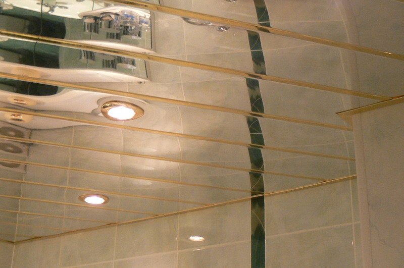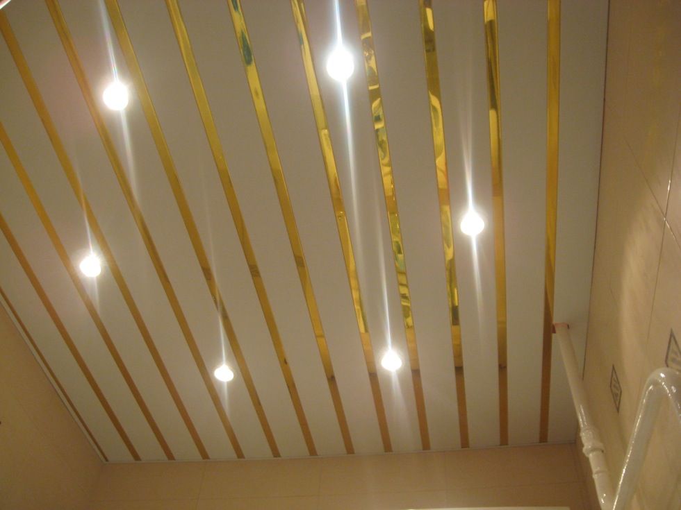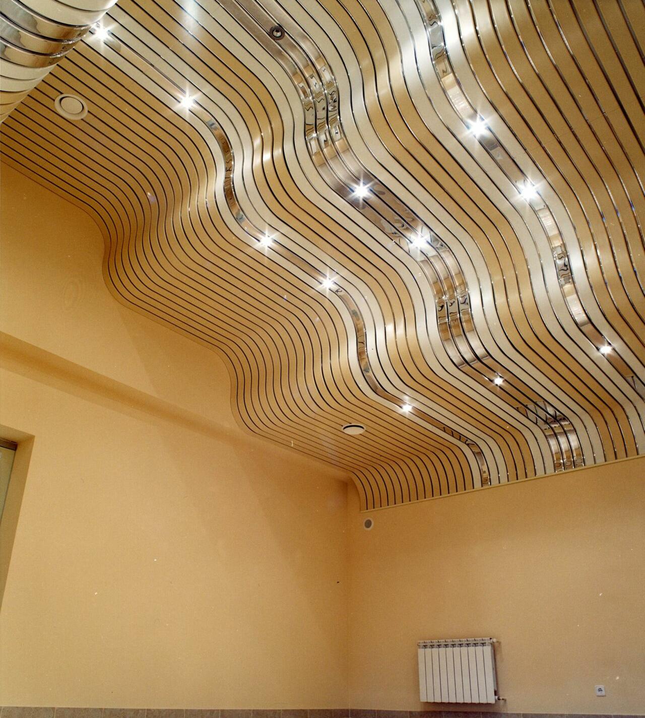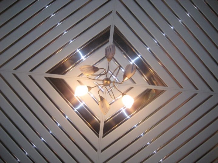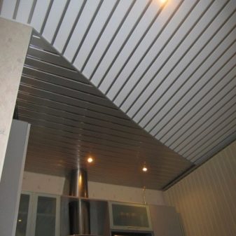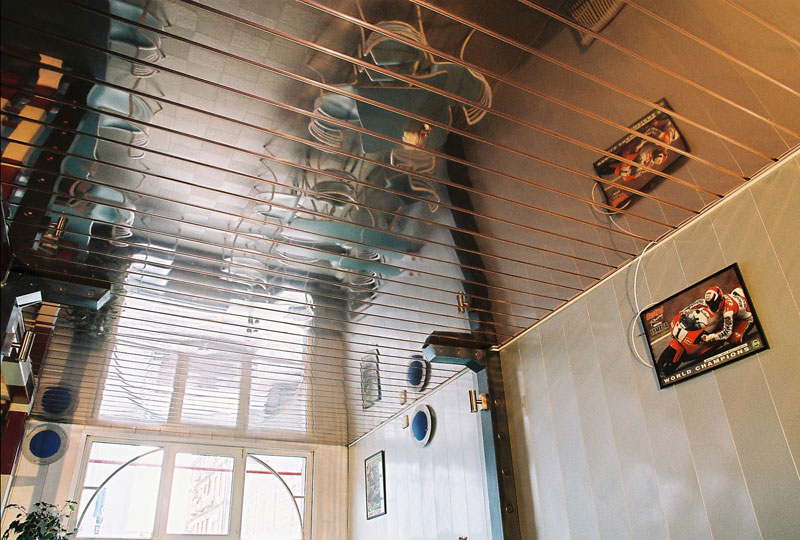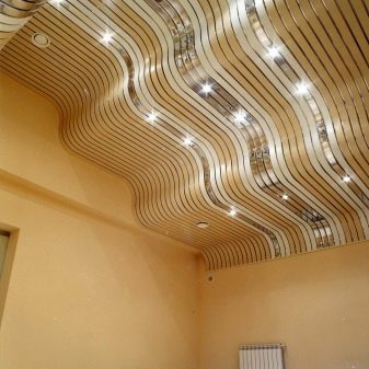 Sie können das Design der Decke mit verschiedenen Arten der Installation variieren. Zum Beispiel, gestapelt nahe beieinander Schienen, es stellt sich heraus, eine glatte monochromatische Oberfläche, gut reflektierendes Licht. Kleine Lücken zwischen den Lamellen sind leicht mit dekorativen Elementen zu decken und eine solche Decke zeichnet sich durch eine hervorragende Belüftung aus. Darüber hinaus reflektiert die Gestelldecke das Licht perfekt, daher sollte diese Funktion bei der Organisation der Beleuchtung verwendet werden.