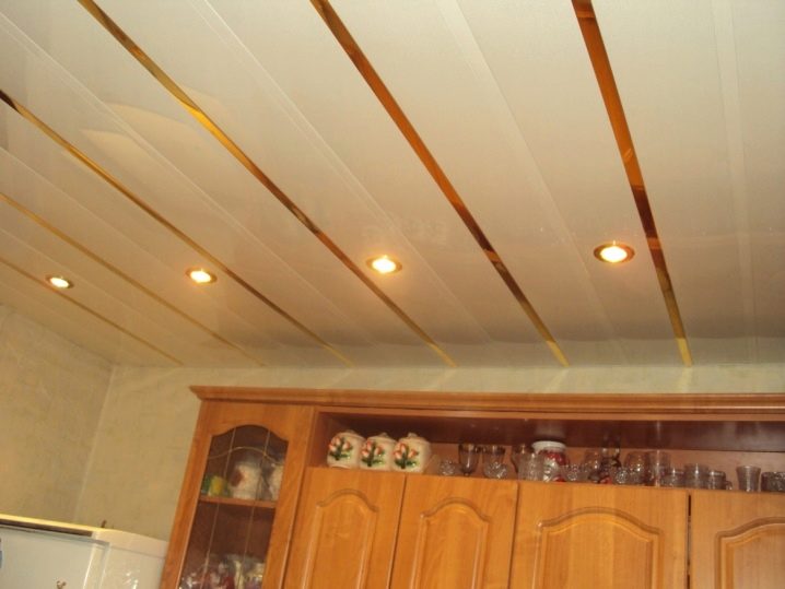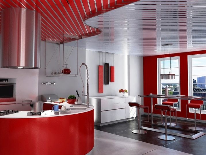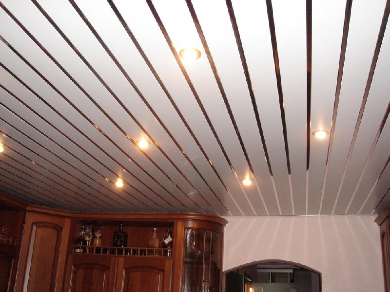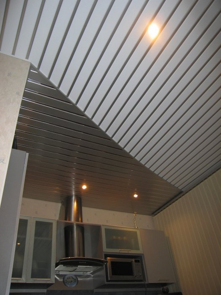 Rack-Decke ist eine Beschichtung aus einzelnen Metalllamellen verschiedener Formen zusammengesetzt. Dank der Verwendung von speziellen dekorativen Einsätzen wird am Ende der Montagearbeiten eine feste Oberfläche mit einer abgerundeten oder flachen Form erhalten. Oft bevorzugen sie in der Küche schöne mehrstufige Strukturen, die die Farbe der Einsätze unterscheiden.
