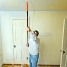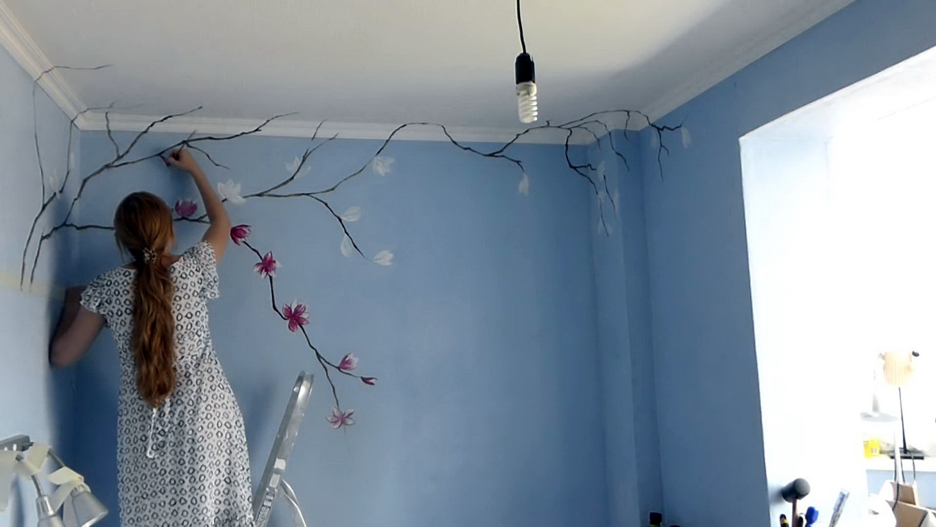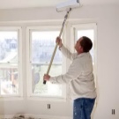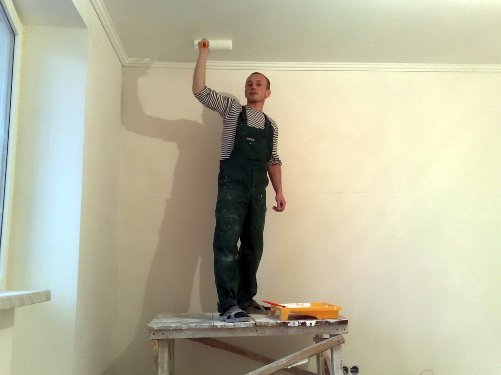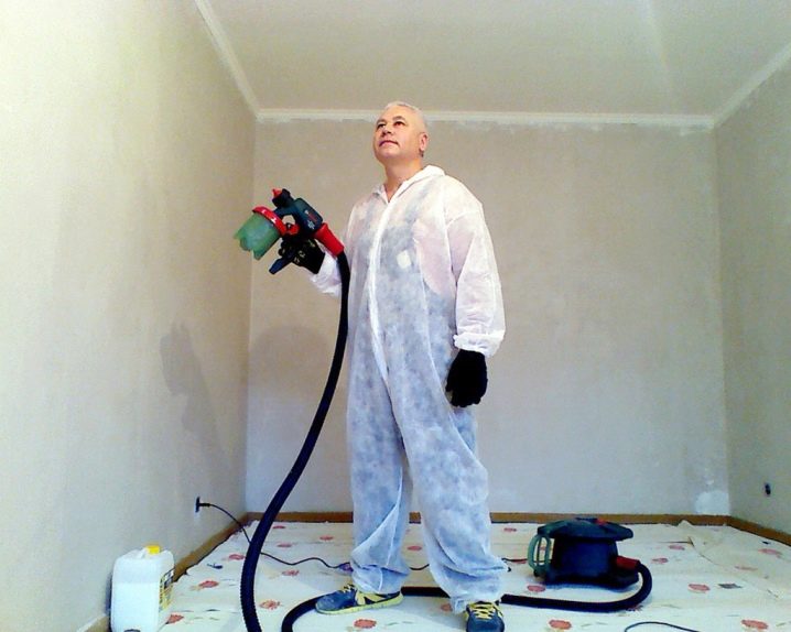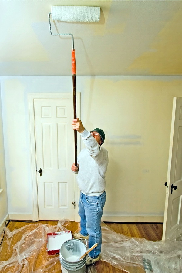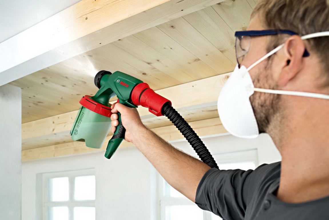 Das Anstreichen der Decke mit einem elektrischen Kompressor und Sprühgerät ist gut, weil die Farbe gleichmäßig über die Oberfläche verteilt wird und das Material selbst so viel wie möglich gespart wird.Der Nachteil liegt in der teuren Ausrüstung (es kann gemietet werden), der Komplexität der Wartung der Einheit, den hohen Kosten für Strom und Lärm während der Arbeit.