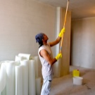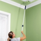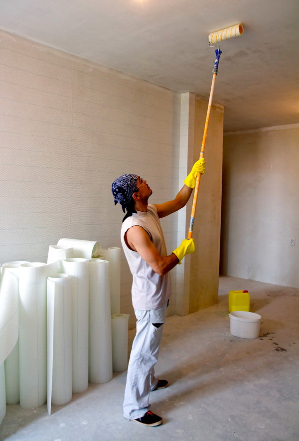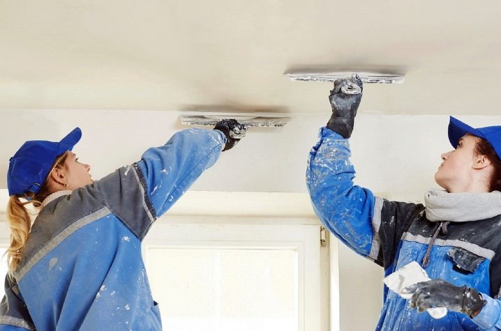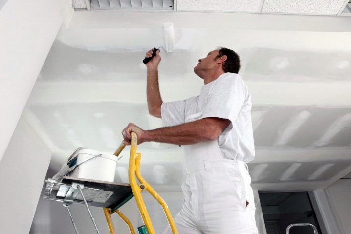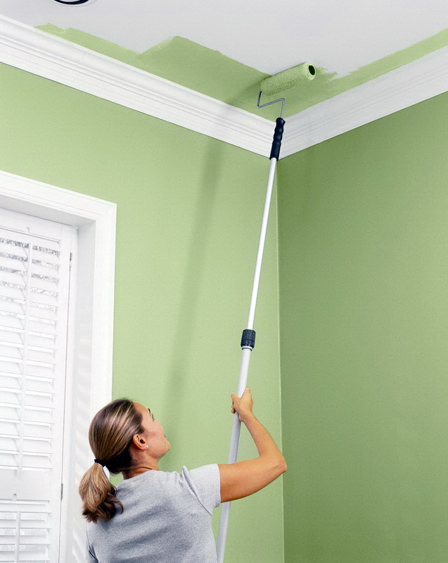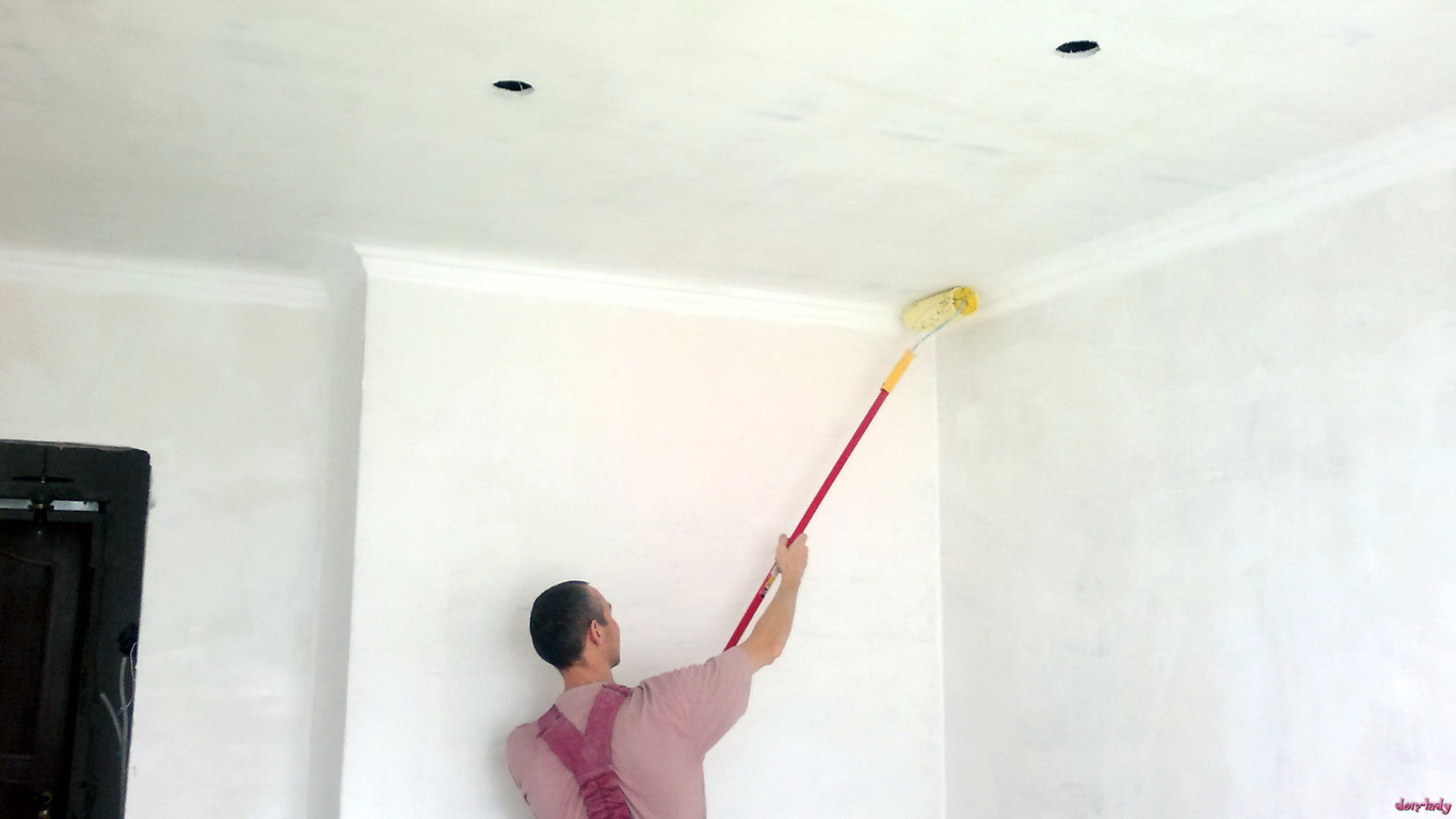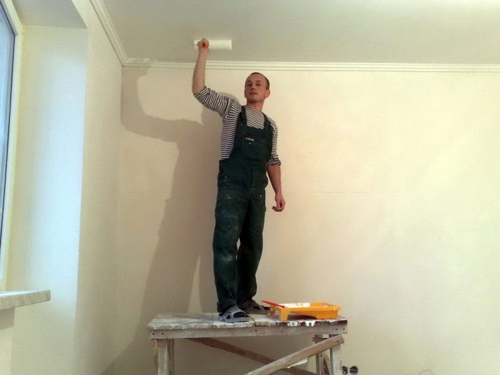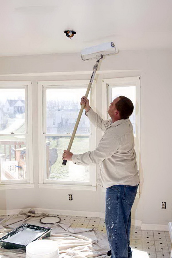 Das Bemalen der Decke kann unabhängig und manuell erfolgen, es erfordert nicht viel Erfahrung und teure Werkzeuge. Benötigt werden: eine Rolle mit langem Stiel, ein Malbad und eine Leiter. Vor dem Abdecken ist es notwendig, die Decke zu reinigen, zu nivellieren und zu grundieren. Die Qualität der Spachtelmasse sollte höher sein als bei Papiertapeten. Es ist optimal in 2 Schichten ausgeführt: der erste Entwurf, der zweite - Finishing, denn es hat sogar eine spezielle Art von Trockenmischung. Vor dem Lackieren ist es notwendig, alle Küchenräume sicher mit Plastikfolie abzudecken.