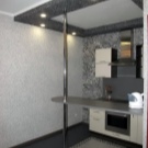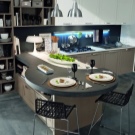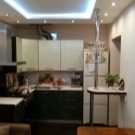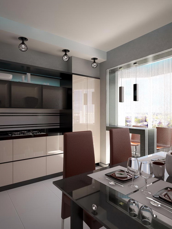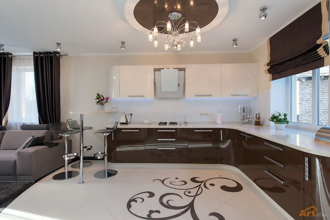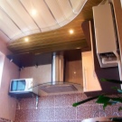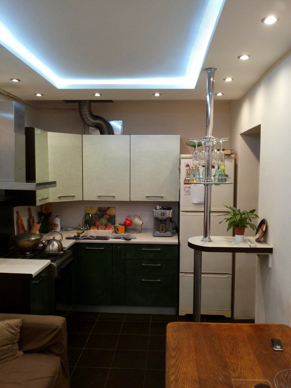 Ungewöhnliches Dekor der Decke in der Küche wird erreicht, indem man mehrere Niveaus mit lockigen Kurven und Spiegeleinsätzen mit zusätzlicher Punktbeleuchtung schafft. Der Spiegel fügt optisch Raum hinzu und das zusätzliche Licht schafft eine gemütliche Atmosphäre.