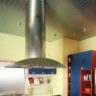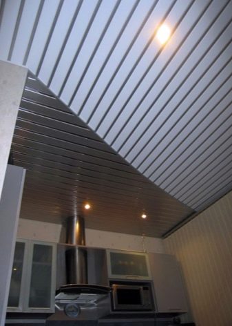 Rack-Decken für die Küche sind auf einem rechteckigen Rahmen auf horizontaler Ebene mit Aluminium-Lamellen montiert, mit schützenden farbigen Schichten bedeckt. Ihre Länge beträgt 3 und 4 m, so dass sie vollständig in die Breite eines Standardzimmers passen. Farben können je nach Oberfläche glänzend, matt, monoton oder mit unterschiedlichen Texturen sein. Es ist möglich, eine beliebige Farbe für das vorhandene Interieur zu wählen. Die Vorteile von Flussdecken in der Küche: