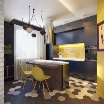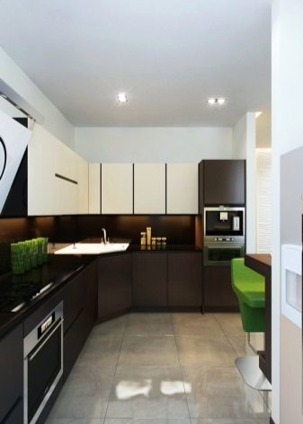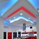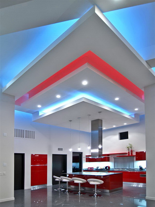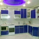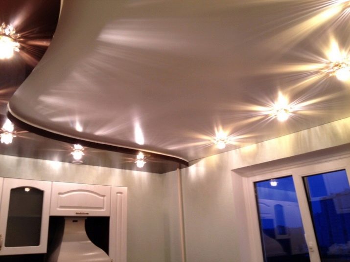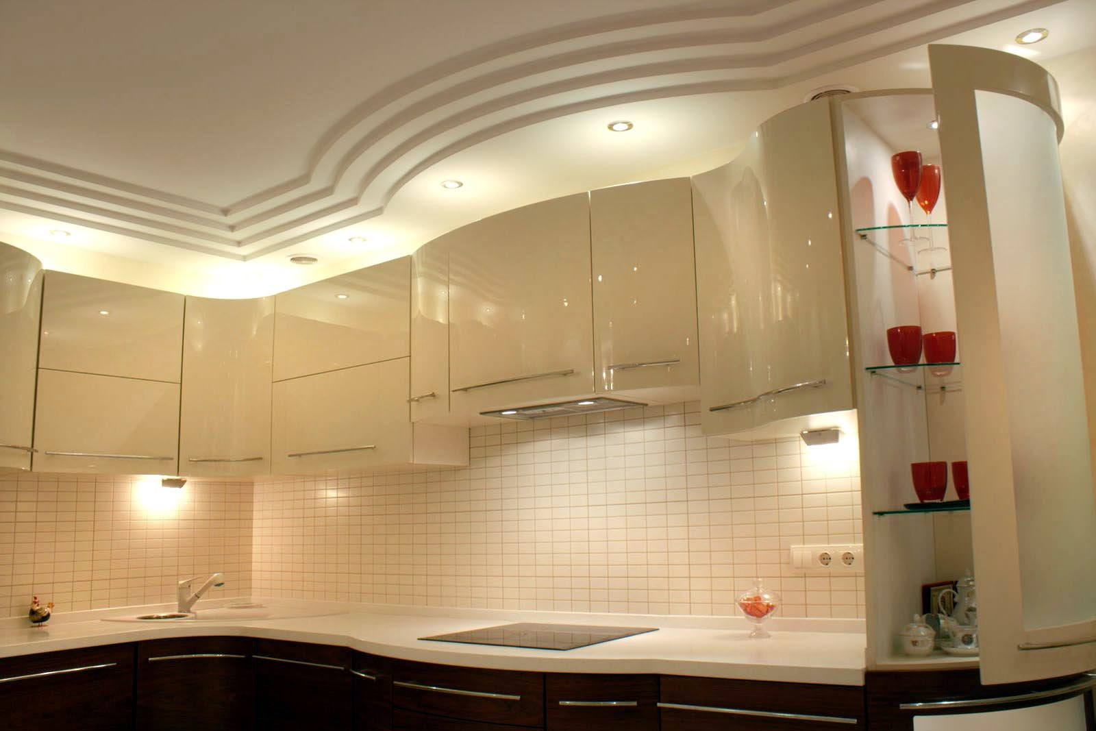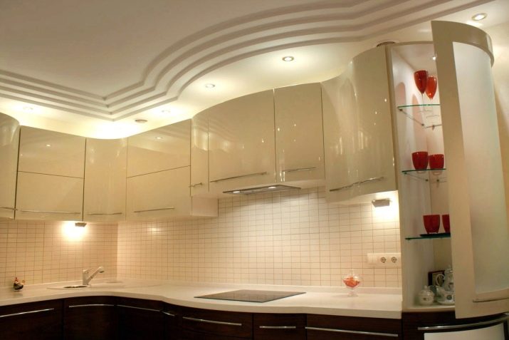 In der modernen Küche, wie auch in anderen Räumen, ist es möglich, hängende mehrstöckige Decken mit Spotbeleuchtung zu installieren. Lampen können im Übergang zwischen den Ebenen versteckt oder in einer Reihe über dem Ofen und der Tischplatte angeordnet werden.Spann- und Zwischendecken wirken sich in Räumen mit niedrigen und hohen Decken unterschiedlich auf die Optik aus. Wenn die Höhe 2,2-2,5 m beträgt, ist sie noch besser in der Lage, Beschichtungen dieser Art auszuwählen.