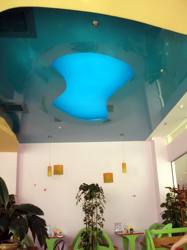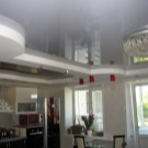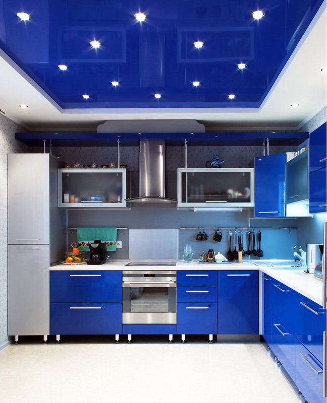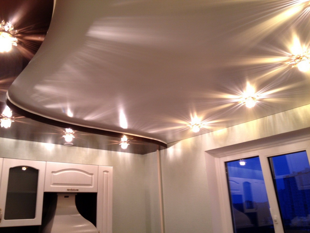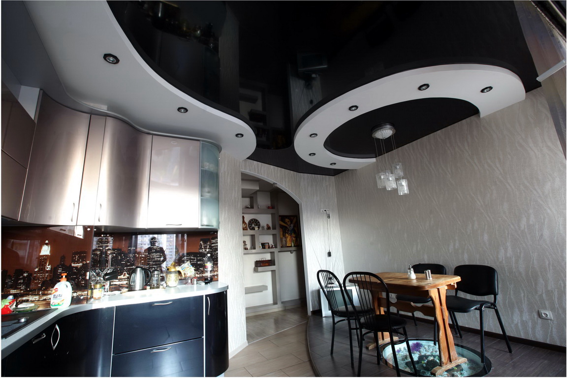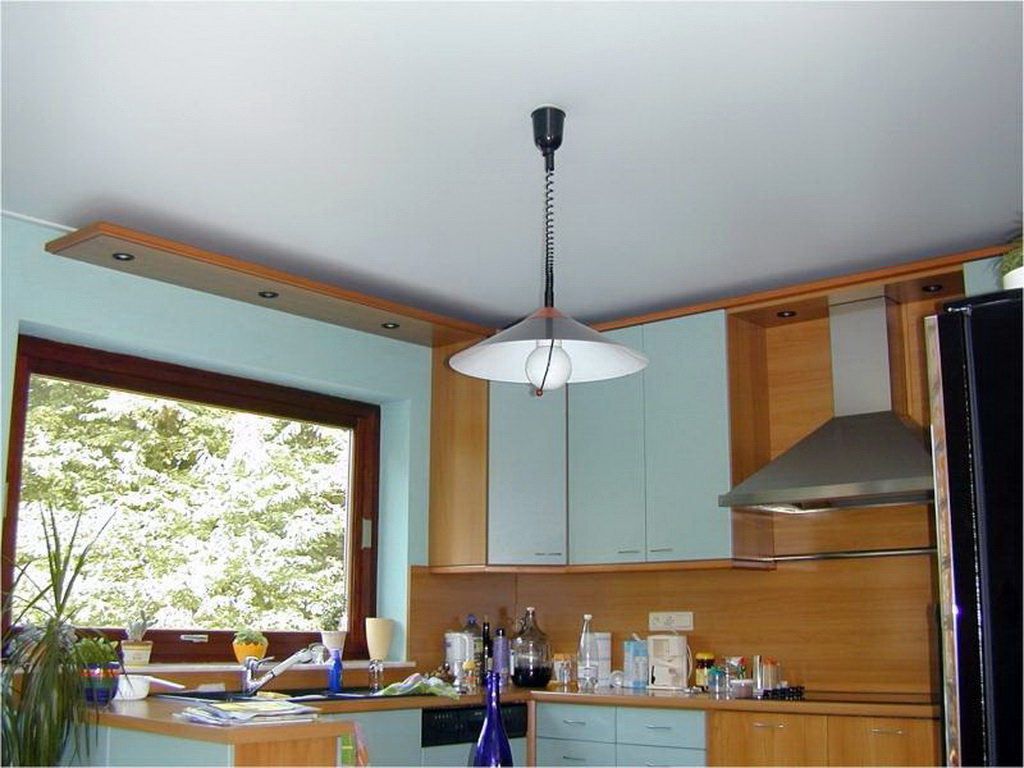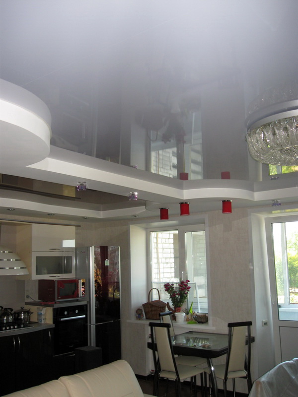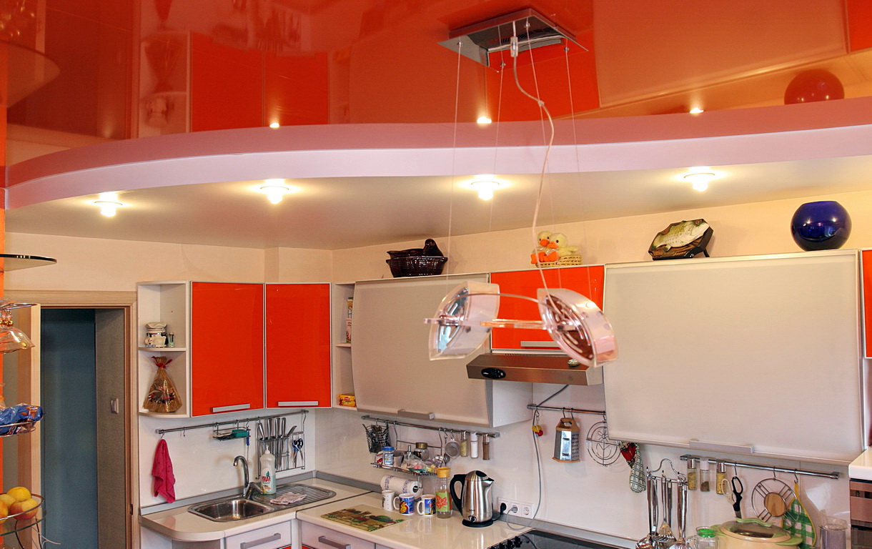 Spanndecke perfekt glatt, ohne die kleinsten Mängel, leicht zu reinigen und sehr beeindruckend aussieht. Aber seine Installation ist nicht einfach, es erfordert das Strecken des synthetischen Gewebes in der Anwesenheit von speziellen Geräten und bei hohen Temperaturen. Um solche Arbeiten durchzuführen, können nur erfahrene Fachleute. Bei der Installation müssen Sie sich sofort um die Position der eingebauten Lampen kümmern, ersetzen Sie den Platz für sie in Zukunft nicht funktionieren.Aber wenn es von oben überflutet wird, wird das gesamte Wasser von der Leinwand zurückgehalten und nicht auf die Küchenmöbel, den Boden und die Wände verschüttet. Es ist möglich, mehrstöckige Decken in der Küche, deren obere Schicht gespannt wird, und die untere Ebene der Gipskartonplatte mit Veredelung zu schaffen.