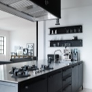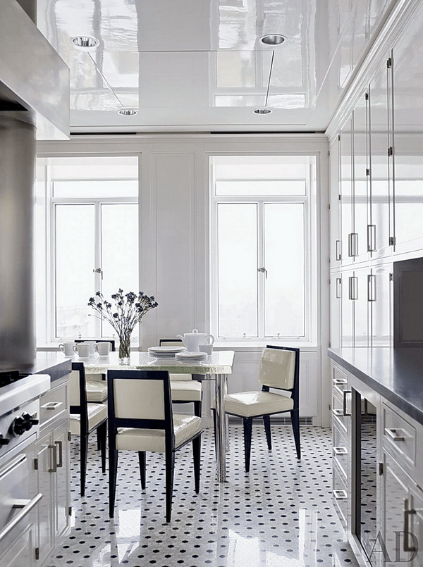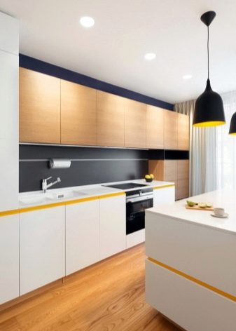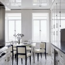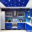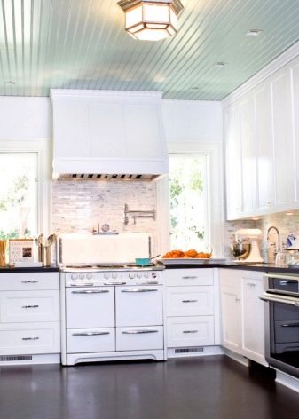 Für die Küche sollten Sie eine Deckenverkleidung wählen, die farblich mit dem übrigen Innenraum und den Möbeln kombiniert ist. Wenn die Methode der Fertigstellung ist Malerei, dann ist die universelle Option weiße Acryl oder sehr helle Farben. Sie sind als Kontrast für schwarze Küche und die gleichen Haushaltsgeräte geeignet. Um ein einzelnes Bild der Wände und der Decke zu erstellen, können Sie die gleiche Farbe verwenden - matt oder glänzend.