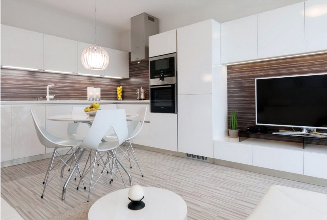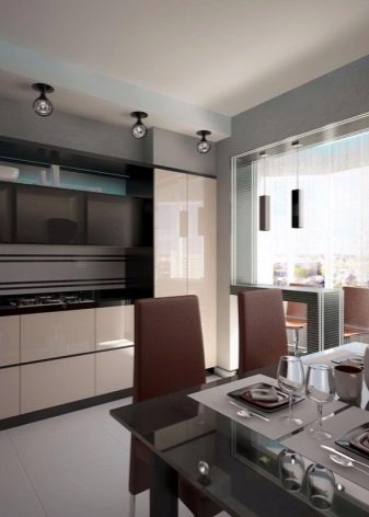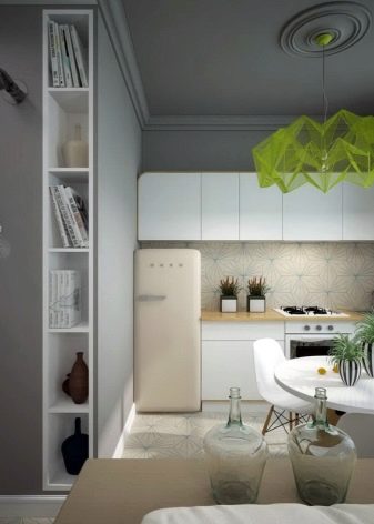 Spanndecken, die ein modernes und eindrucksvolles Aussehen schaffen, passen zum trendigen Interieur der Küche. Sie sollten keine Angst haben, sie für einen Raum zu verwenden, in dem Nahrung ständig vorbereitet wird, sie sind hitzebeständig und werden leicht von irgendwelchen Flecken abgewaschen. Es ist am besten, glänzende Arten von hellen Farbtönen zu wählen.