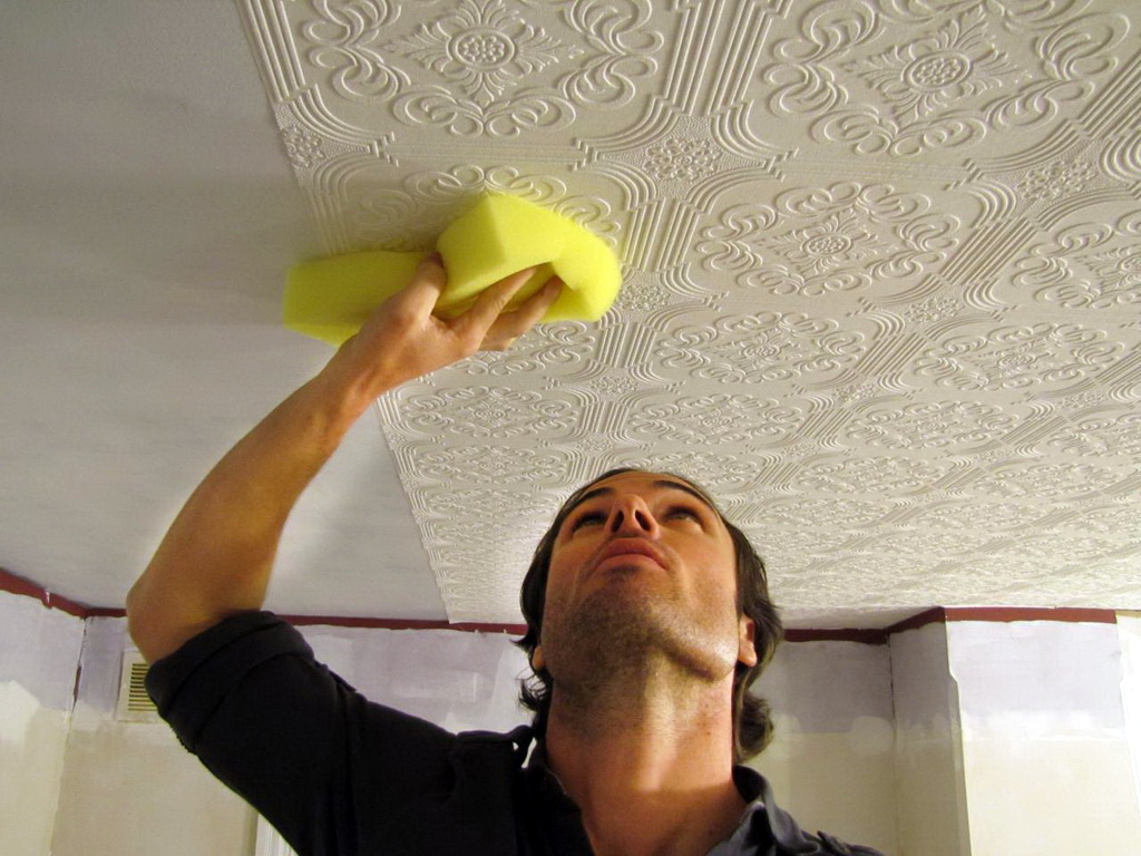 Die Oberfläche unter der Decke Tapete ist auf die gleiche Weise wie unter der Tünche gereinigt, können Sie eine dünne Schicht von flüssigen Kitt verwenden. Viele empfehlen, den gleichen Tapetenkleber als Grundierung zu verwenden. Vor dem Kleben ist es notwendig, einen freien Bereich des Bodens zum Verteilen mit Klebstoff vorzubereiten, um die Möbel vor Flecken zu schützen. Die markierten und geschnittenen Rollen werden dabei an der Decke angebracht und geglättet. Während und nach der Arbeit für 6-8 Stunden ist es unerwünscht, etwas in der Küche zu kochen oder zu lüften.