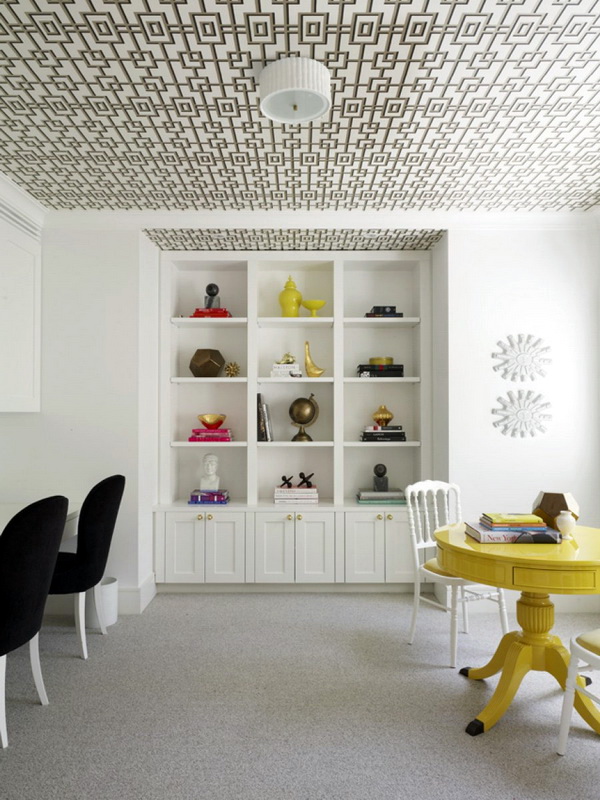 Um die Decke in der Küche zu beenden, müssen Sie feuchtigkeitsbeständig waschbare Tapete wählen. Bei Küchenwänden wird diese Art der Beschichtung oft verwendet, aber die Deckenverkleidung hat ihre eigenen Eigenschaften: genau an der Spitze sammelt sich die erwärmte Luft und der gesamte Ruß gelangt dorthin. Daher kann die Tapete im Laufe der Zeit schmutzig werden oder hinter der Oberfläche zurückbleiben. Optimale Verwendung der Vinyl-Optik, auch wenn sie verschmutzt sind, können sie überstrichen werden, gereinigt mit einem feuchten Tuch von Schmutz.