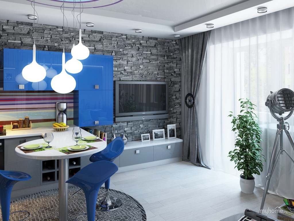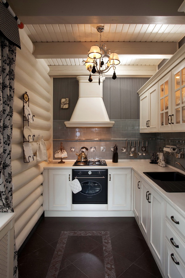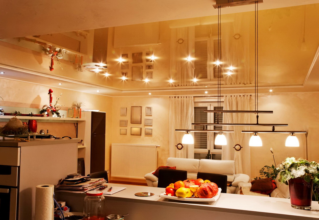 Deckenleuchten für die Küche können die traditionellen aufnehmen - Glühlampen, modische Energiesparlampen mit Tageslicht und Einbauleuchten: LED, Leuchtstofflampen und Halogenlampen. Wenn die Decke gestrichen, mit Tapeten oder Fliesen verputzt, weiß getüncht wird, gibt es wegen der fehlenden Nische keine Möglichkeit, Lampen darin einzubetten. In diesem Fall wird eine gewöhnliche Zwischendecke mit einem Kronleuchter Ihrer Wahl und Lampen aus dem 220 V-Netz gewählt.Die Vorteile dieser Methode liegen auf der Hand: niedrige Lampenkosten, einfache Austauschbarkeit, keine komplizierte Installation.