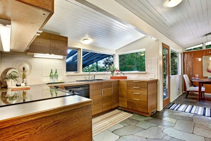 In einem privaten Haus ist es am besten, eine Beschichtung mit einem Rahmen aus feuerfestem Trockenbau zu verwenden. Ein Dekor aus Farbe, die keiner Feuchtigkeit, Temperaturextremen und Deformationen ausgesetzt ist, wie Metall- oder Kunststoffplatten. In einem Holzhaus können Sie Küchenflurdecken mit natürlichen Holztexturen installieren.