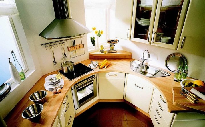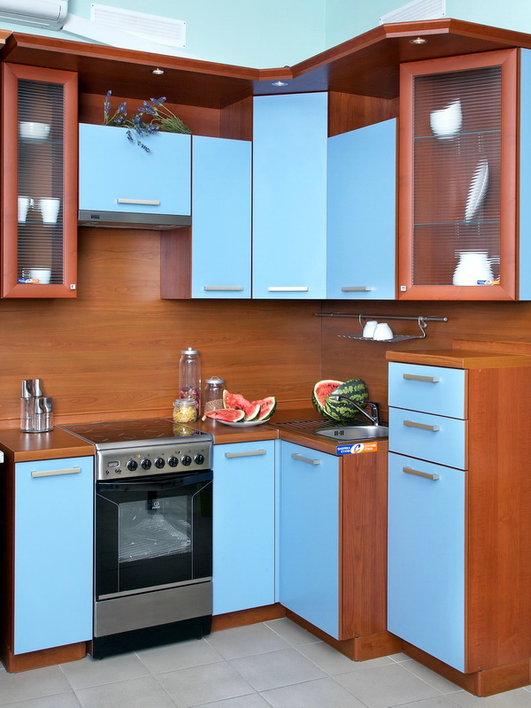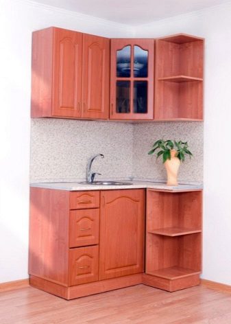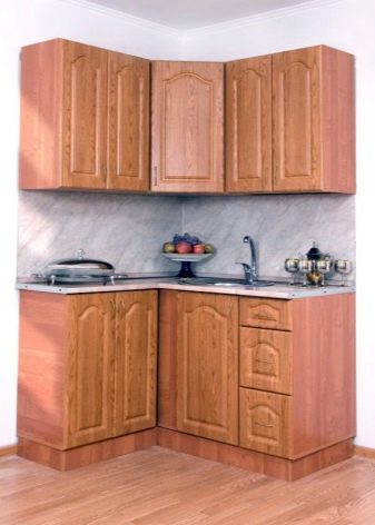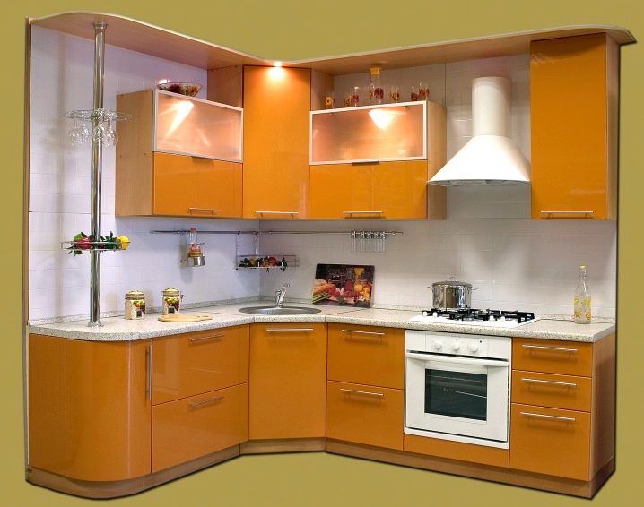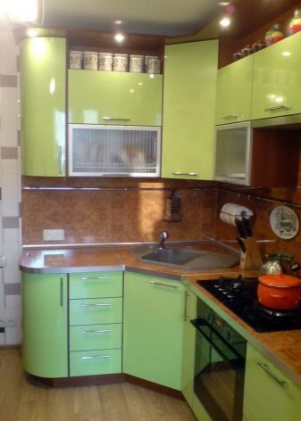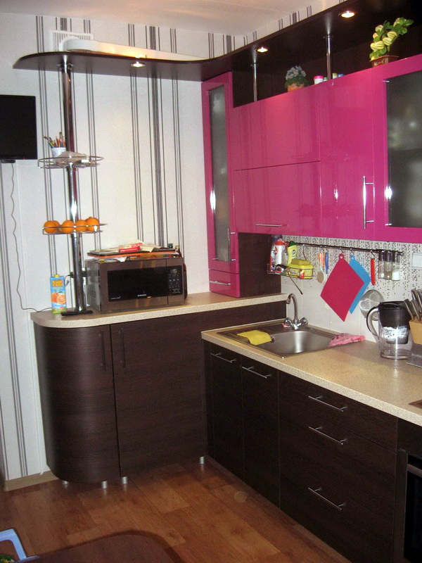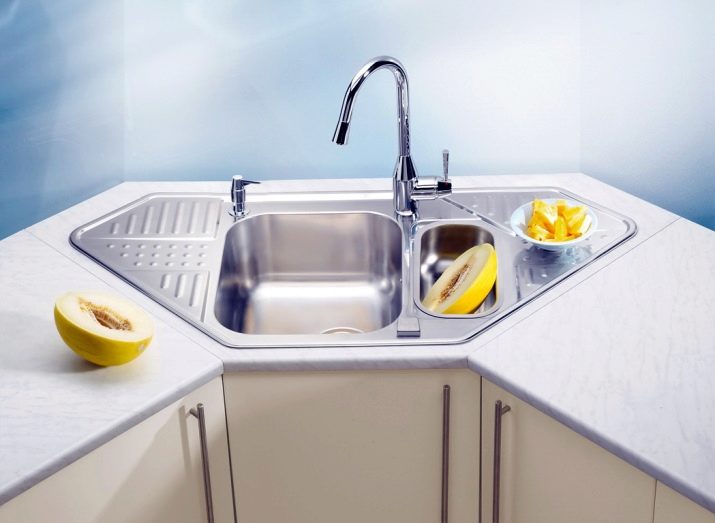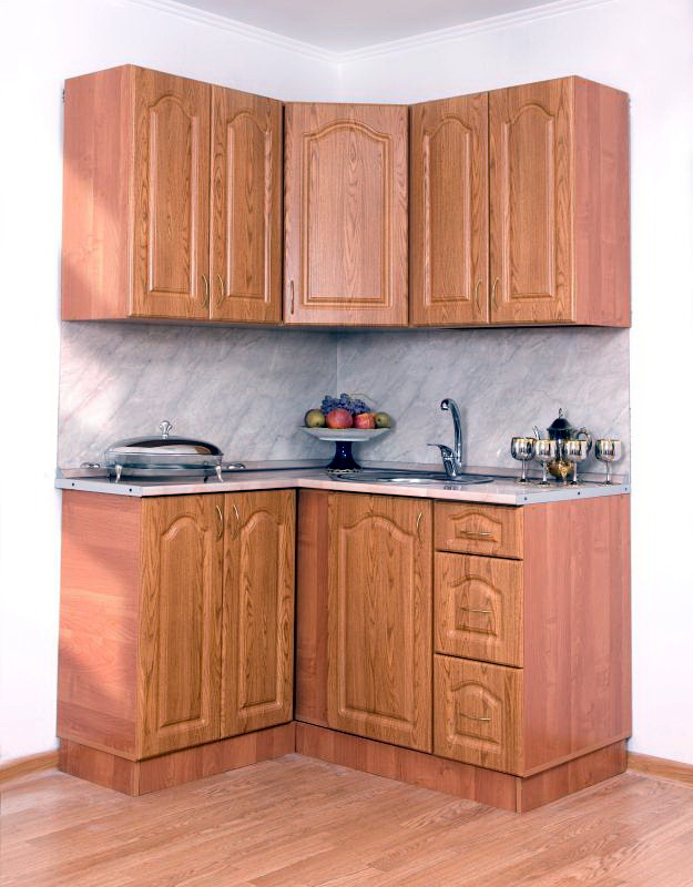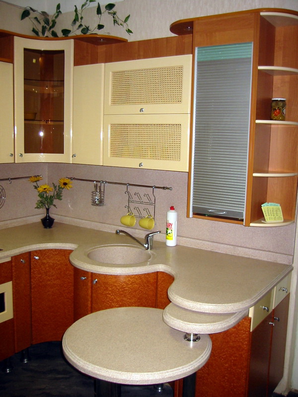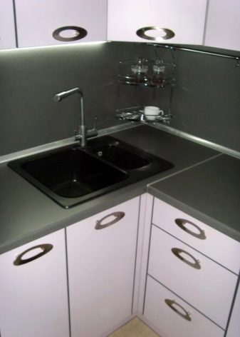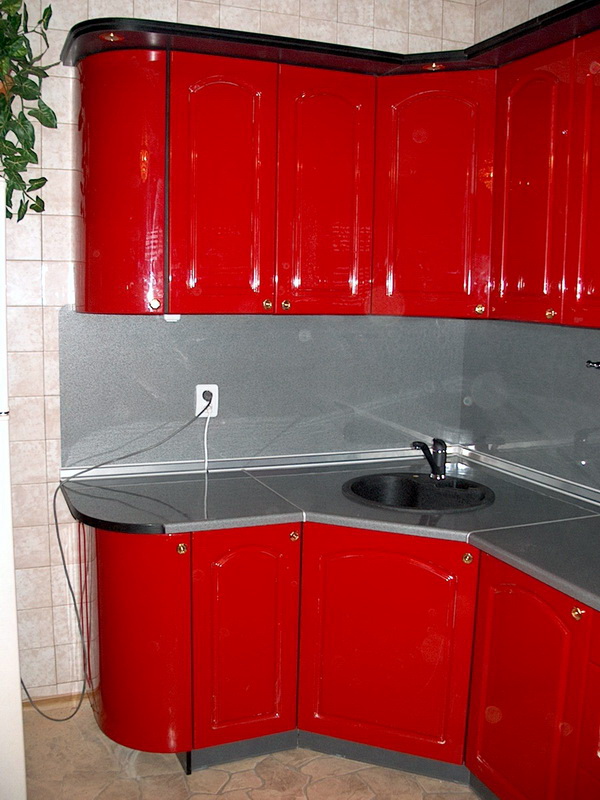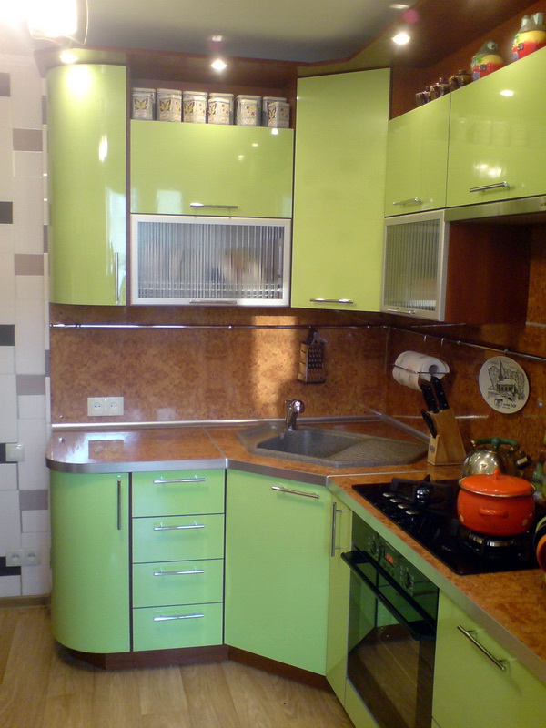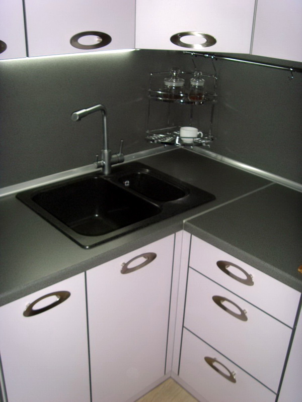 Eckschrank hat seine Vorteile. Der Raum in den Ecken wird überhaupt nicht benutzt, aber das eckige Design löst dieses Problem. Dieser Schrank ist besonders relevant, wenn Ihre Küche klein ist. Waschbecken in der Ecke ist immer leicht zugänglich, diese Anordnung optimiert den Kochvorgang.