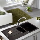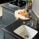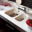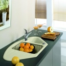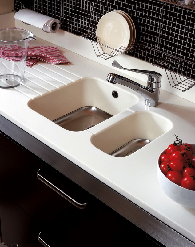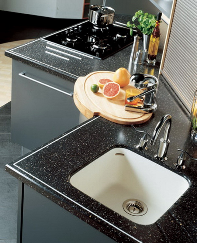 In diesem Stadium müssen Sie die Spüle einbetten. Machen Sie eine Schablone über die Größe der Spüle und legen Sie sie auf die Arbeitsplatte. Genau so können Sie die gewünschte Kontur wiederholen. Konturschablone Kontur. Machen Sie ein paar Löcher entlang der Innenseite, damit das Stichsägeblatt besser befestigt wird. Mit seiner Hilfe schneiden Sie ein Loch der erforderlichen Größe. Es ist wichtig, dass das Waschbecken dicht ist. Die innere Umrandung sorgfältig mit Dichtmittel bestreichen und die Spüle hineindrücken.Diese Methode der Befestigung der zuverlässigsten und gebräuchlichsten.