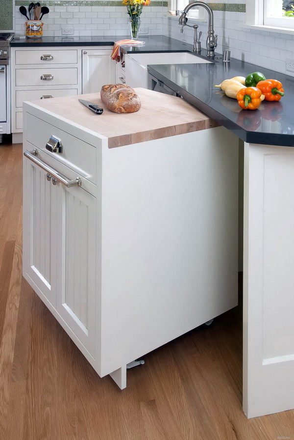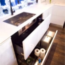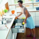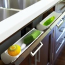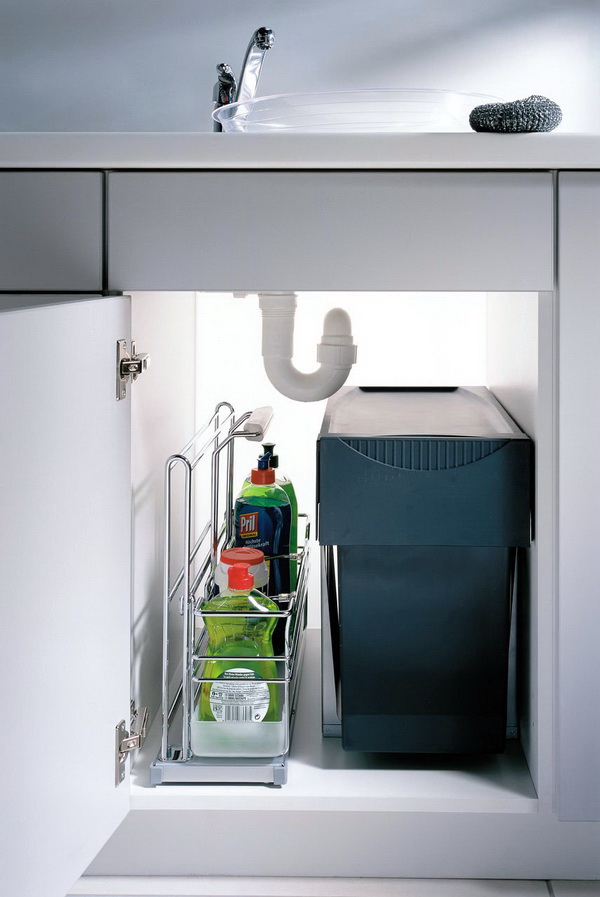 Die wichtigsten Schränke unter der Spüle haben nur die Türen. Aber es gibt Designs mit Schubladen. Diese Boxen sind auf den Rolltischen befestigt und haben eine spezielle Form mit Kerben für Rohre. Diese Design-Option benötigt wenig Platz unter der Spüle, ermöglicht aber die Lagerung von Waschmitteln, Schwämmen und Tüchern. Dies ist eine geeignete Option, wenn Sie bereits genügend verschiedene Schränke haben.
