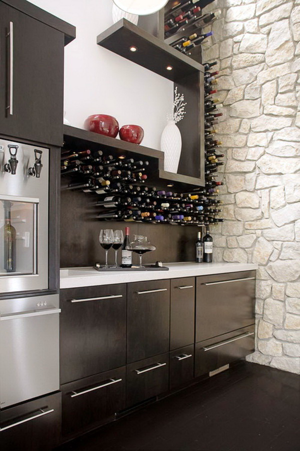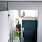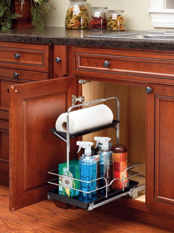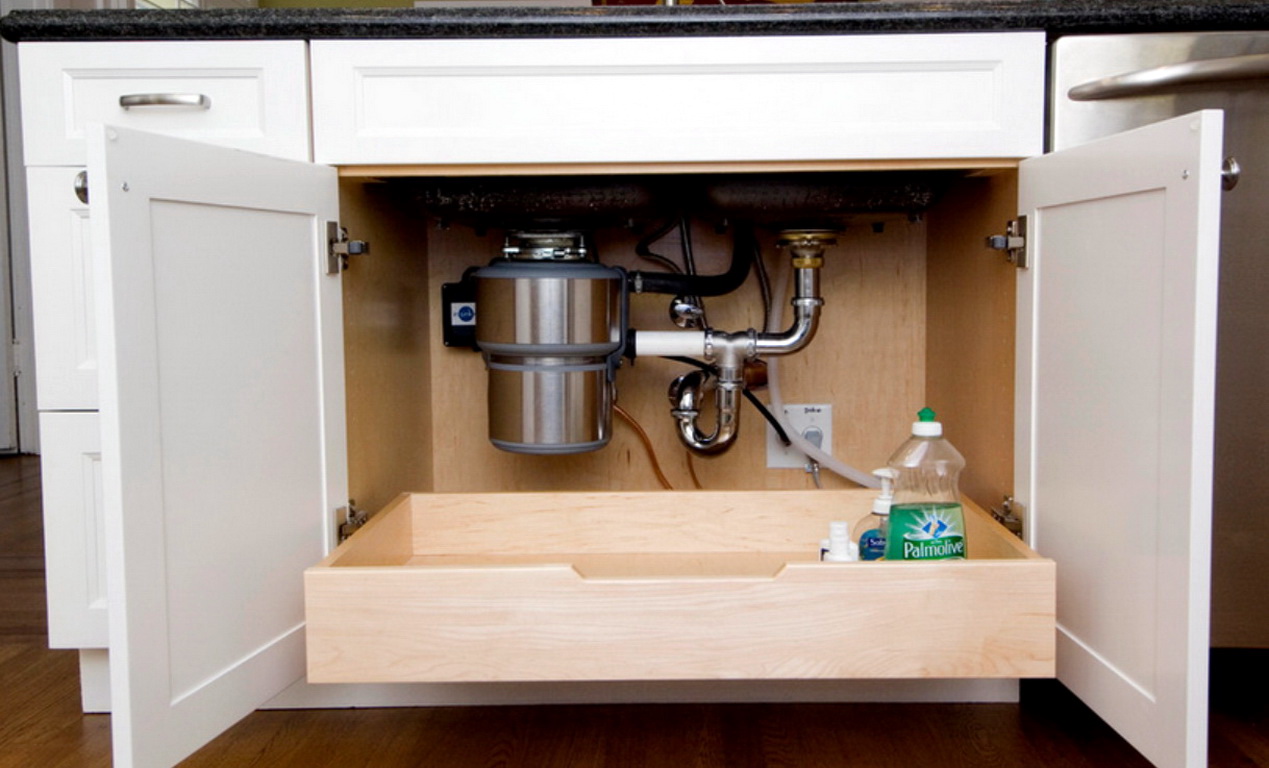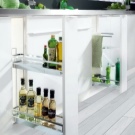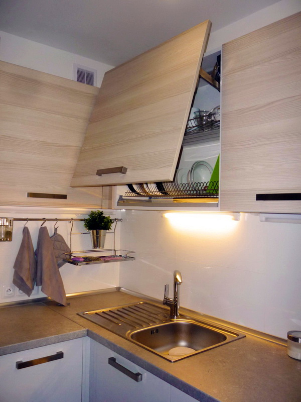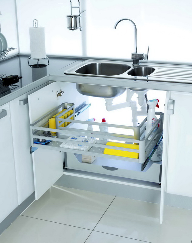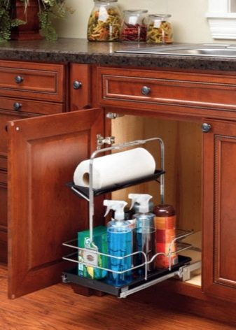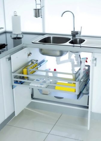 Im Inneren der Spüle selbst kann der Schrank komplett leer sein, dort können einfach Teile der Spüle und der Rohre verborgen sein. Häufiger sind in dieser Nische verschiedene Schubladen, Regale oder Körbe. Sie können einen kleinen Organizer an der Schranktür selbst haben. Einige nutzen diesen Ort mit noch größeren Nutzen und Speichermechanismen zum Filtern oder Heizen von Wasser dort. Zusätzlich können Sie innen ein Tablett für verschiedene Küchenaccessoires aufstellen.