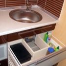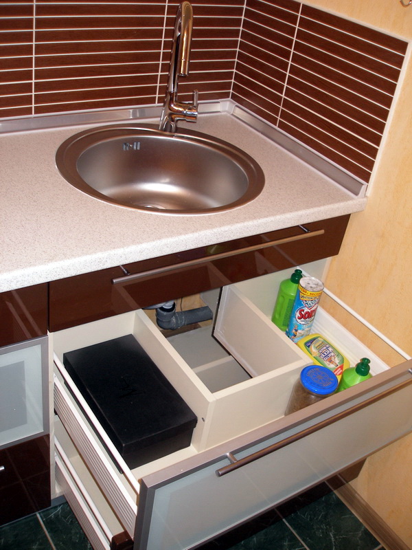 - Schubladen. Sie sind in direkten Konfigurationsboxen enthalten.Stellen Sie sicher, dass Vertiefungen unter den Rohren und verborgenen Teilen der Spüle vorhanden sind.