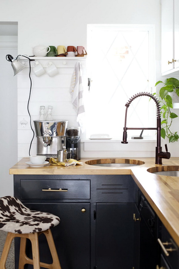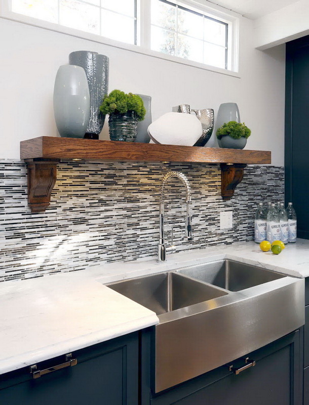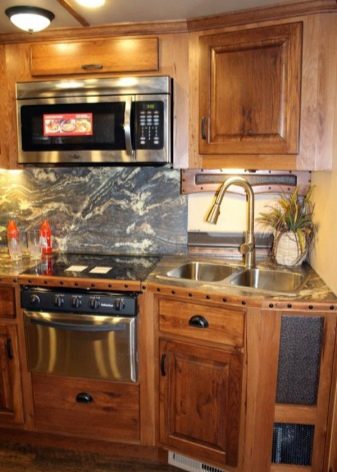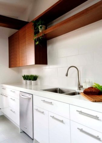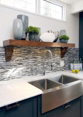 Die meisten Leute bekommen ähnliche Designs für die Küche. In diesem Fall hält der Schrank das Waschbecken und versteckt die Wasserrohre. Außerdem können Sie mit Hilfe des Tisches ein einziges stilistisches Design speichern und das Waschbecken richtig in das Innere einpassen. Dank des Waschbeckens haben Sie zusätzlichen Platz. Unter der Spüle können Sie verschiedene Gegenstände verstecken: Haushaltschemikalien oder einen Eimer für Müll.