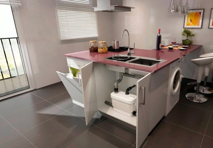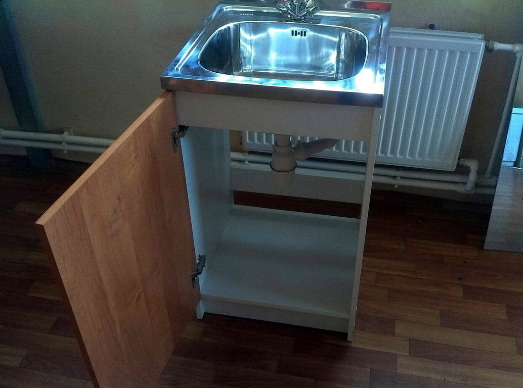 Die Spüle mit dem Schrank sollte dort installiert werden, wo sich die Wasserleitungen befinden. Ansonsten sollten Sie sich um die Vor- und Nachlieferung von Wasser kümmern. Ein flacher Boden ist der Schlüssel zum Erfolg. Wenn Sie Unregelmäßigkeiten auf der Bodenoberfläche haben, verwenden Sie spezielle Substrate.