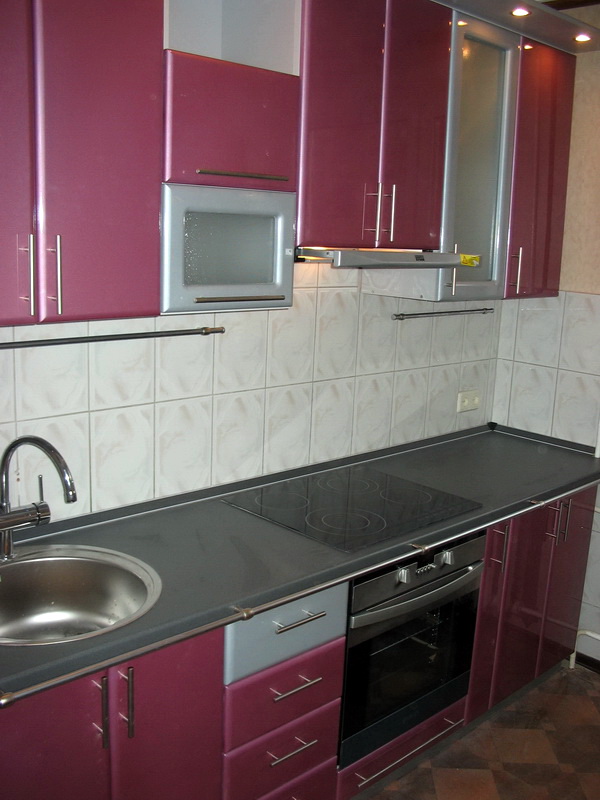 Das gesamte untere Preissegment ist mit einem solchen Headset besetzt. Die Platten sind ziemlich gut, aber empfindlich gegenüber mechanischen Beschädigungen. Wenn sich auf der Oberfläche ein Kratzer oder ein Chip gebildet hat, kann keine Feuchtigkeitsbeständigkeit mehr festgestellt werden. Solche Möbel sind billig, müssen aber oft ersetzt werden.