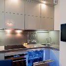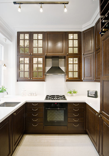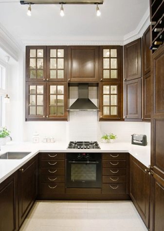 Wenn wir von praktischen Erwägungen ausgehen, ist es besser, die Schränke von der Kochzone weg zu stellen. Dies ist besonders charakteristisch für Möbel aus Naturholz oder Leuchtkästen. Sie werden am schnellsten schmutzig. Um daher nicht viel Zeit für die Reinigung zu verwenden, ist es besser, sie vom Arbeitsraum weg zu platzieren. So werden die Möbel ordentlich aussehen und alle notwendigen Dinge werden immer zur Hand sein.