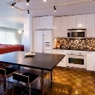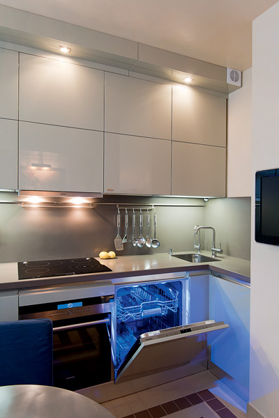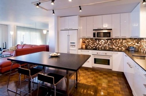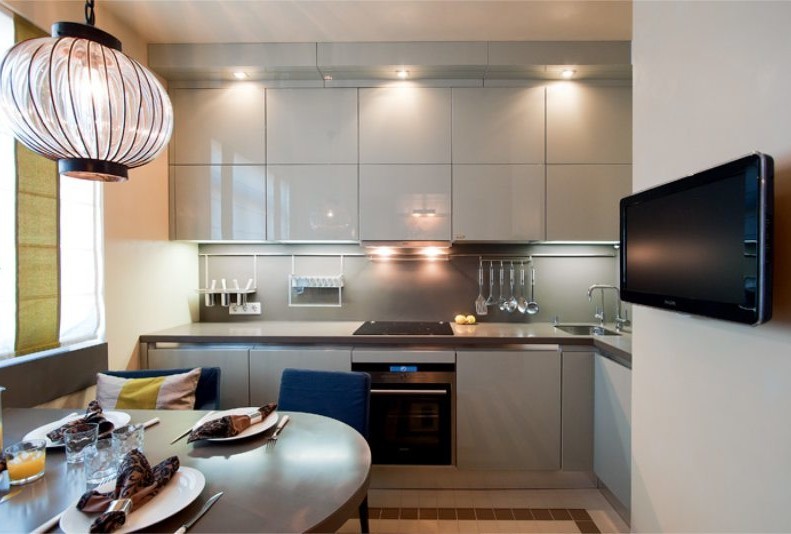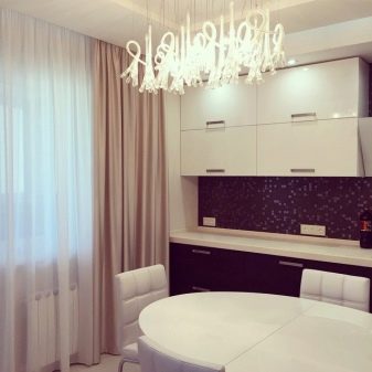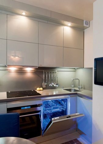 Zusätzlich zu den obigen Möglichkeiten können solche Schränke Teil einer Kücheneinheit sein. In diesem Fall, integrierte Schränke und im gleichen Stil mit dem Rest der Möbel gemacht. Man muss also nicht darüber nachdenken, ob der neue Tisch in den Stil der Schränke passt - alles sieht so organisch und passend aus.