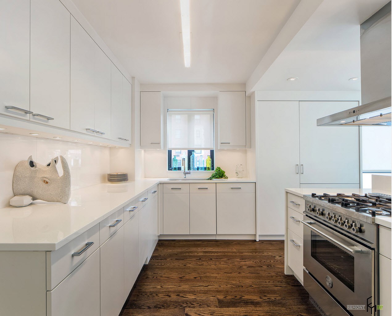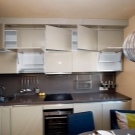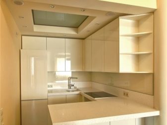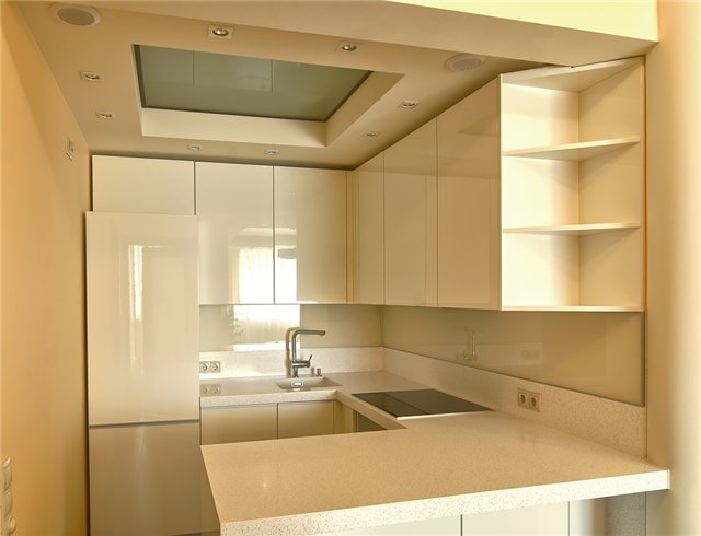 Bis heute, Küchenschränke, bis zur Decke - das ist auch eine gute Option für die Lagerung aller notwendigen Dinge. Einbauschrank mit Regalen an der Spitze - es ist sehr praktisch und praktisch. Anstatt alles einfach auf den Schrank zu stellen, verstecken Sie bequem die notwendigen Dinge in den Regalen und verstecken sie vor neugierigen Blicken hinter der Tür.