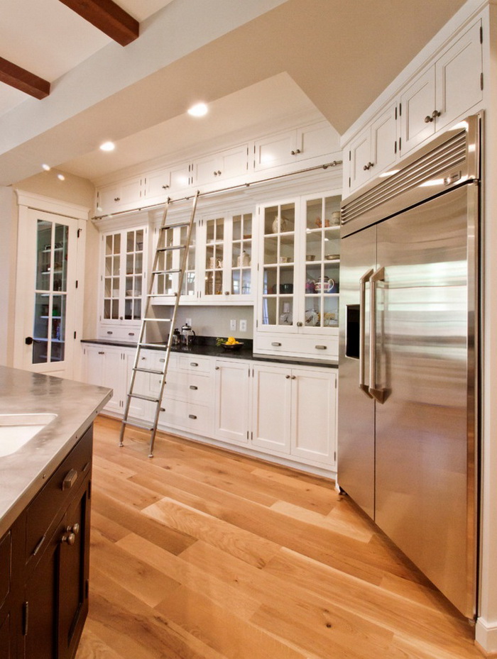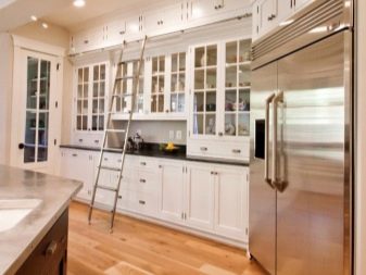 Angesichts der Vor- und Nachteile ist es unmöglich, die Mängel solcher Möbel nicht zu erwähnen. Bis zu hohen Regalen ist es in der Regel sehr schwer zu erreichen. Vor allem, wenn die Gastgeberin niedrig ist. Aber es gibt einen Ausweg aus dieser Situation - Sie können spezielle niedrige Leitern für die Küche kaufen, die attraktiv aussehen und Ihnen erlauben, alle notwendigen Dinge aus den Regalen zu holen, wenn Sie sie brauchen.