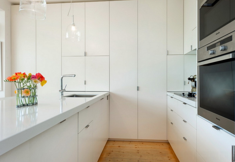 Schränke bis zur Decke sehen in modernen Küchen gut aus, die im Stil von modern oder Hightech hergestellt werden. Unter den Bedingungen des offenen Raumes sehen solche Möbel sehr gut aus. Darüber hinaus sparen diese Schränke sehr gut Platz in der Küche und ermöglichen es Ihnen, sogar eine kleine Küchenzeile geräumiger zu machen.