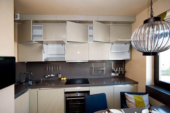 Das Design moderner Küchen ermöglicht es Ihnen, mit dem Standort von Möbeln zu experimentieren. Die traditionelle Option, nämlich die Lage der Schließfächer über der Kochzone, ist bei weitem nicht die einzige und auch nicht die beliebteste.
