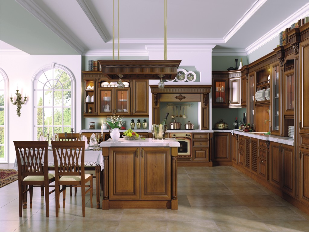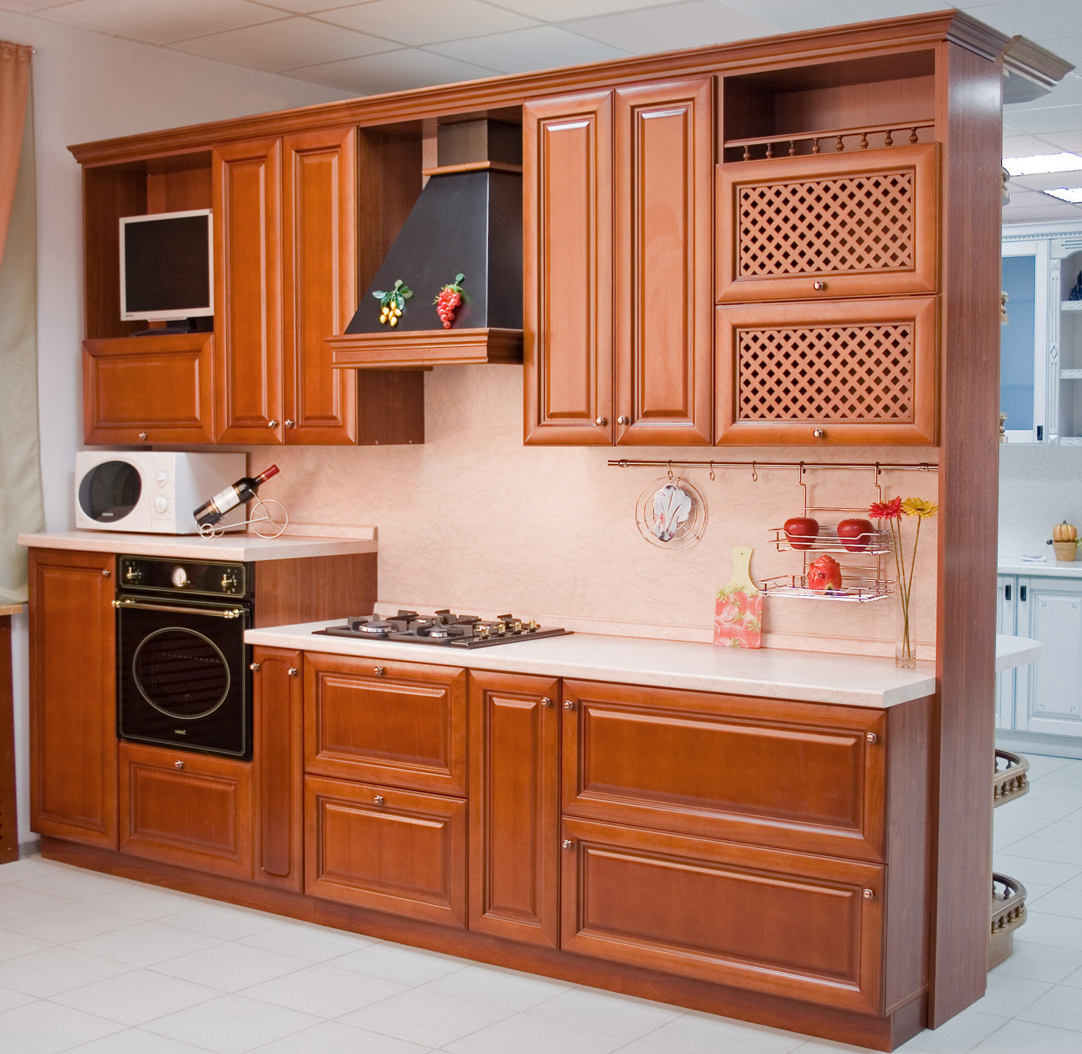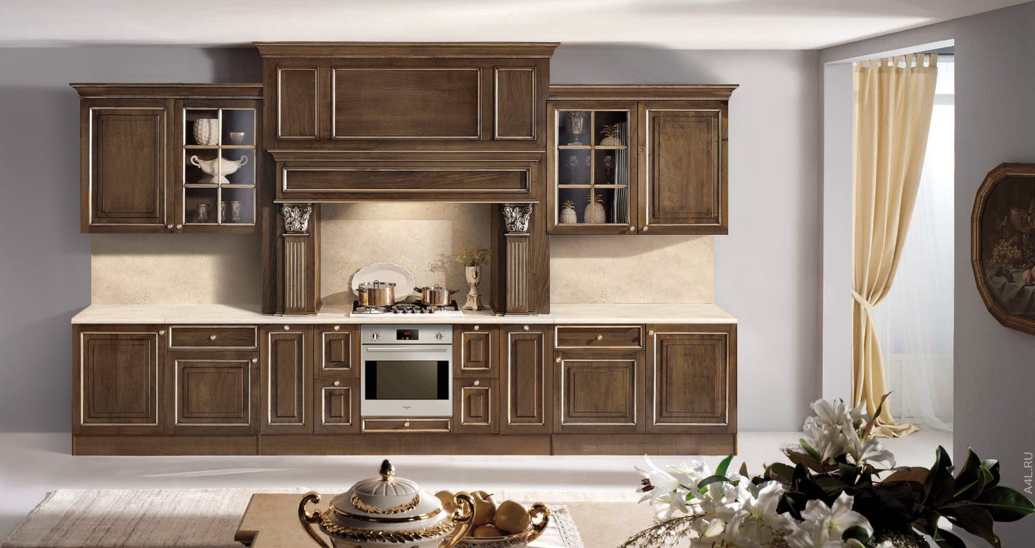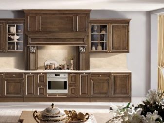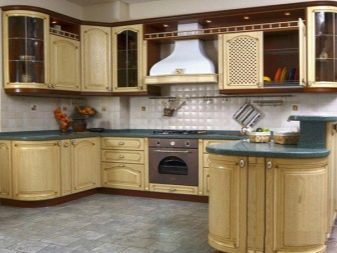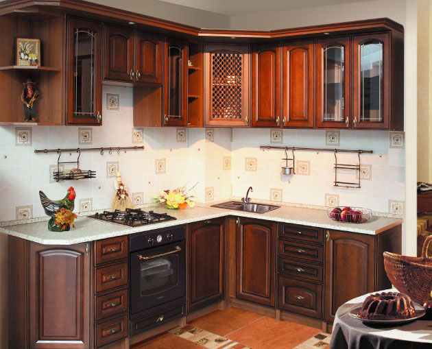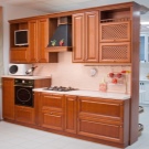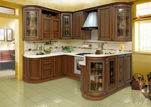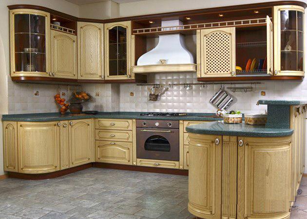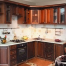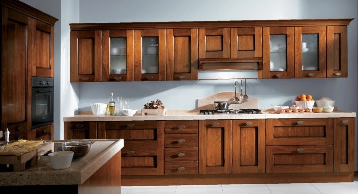 Die klassische Version - Türen und Arbeitsplatten aus Massivholz. In puncto Gesundheit ist es das sicherste Material für Möbel. Natürliches Holz, ohne Chemie, verursacht keine Allergien,Das ist sehr wichtig für Menschen mit gesundheitlichen Problemen. Die Elite-Sorten von Holz sind Eiche, Kirsche, Buche und einige andere Arten. Solche Möbel sind jedoch sehr teuer, auch wenn Sie nur Außenfassaden dieser Steine machen.