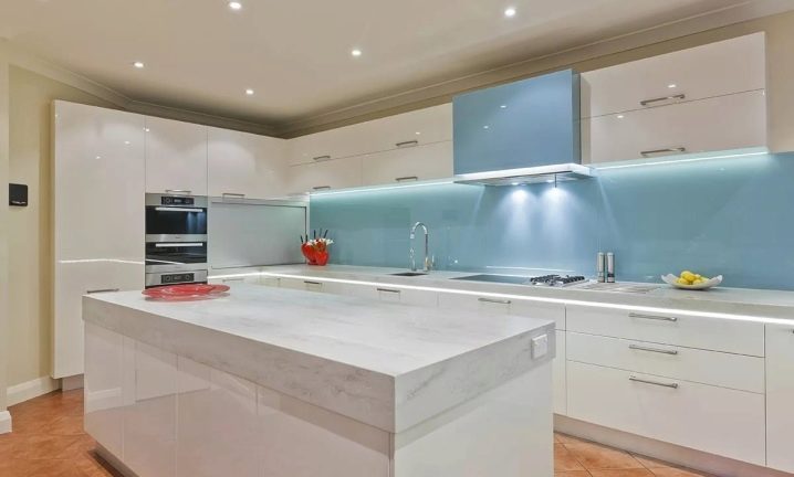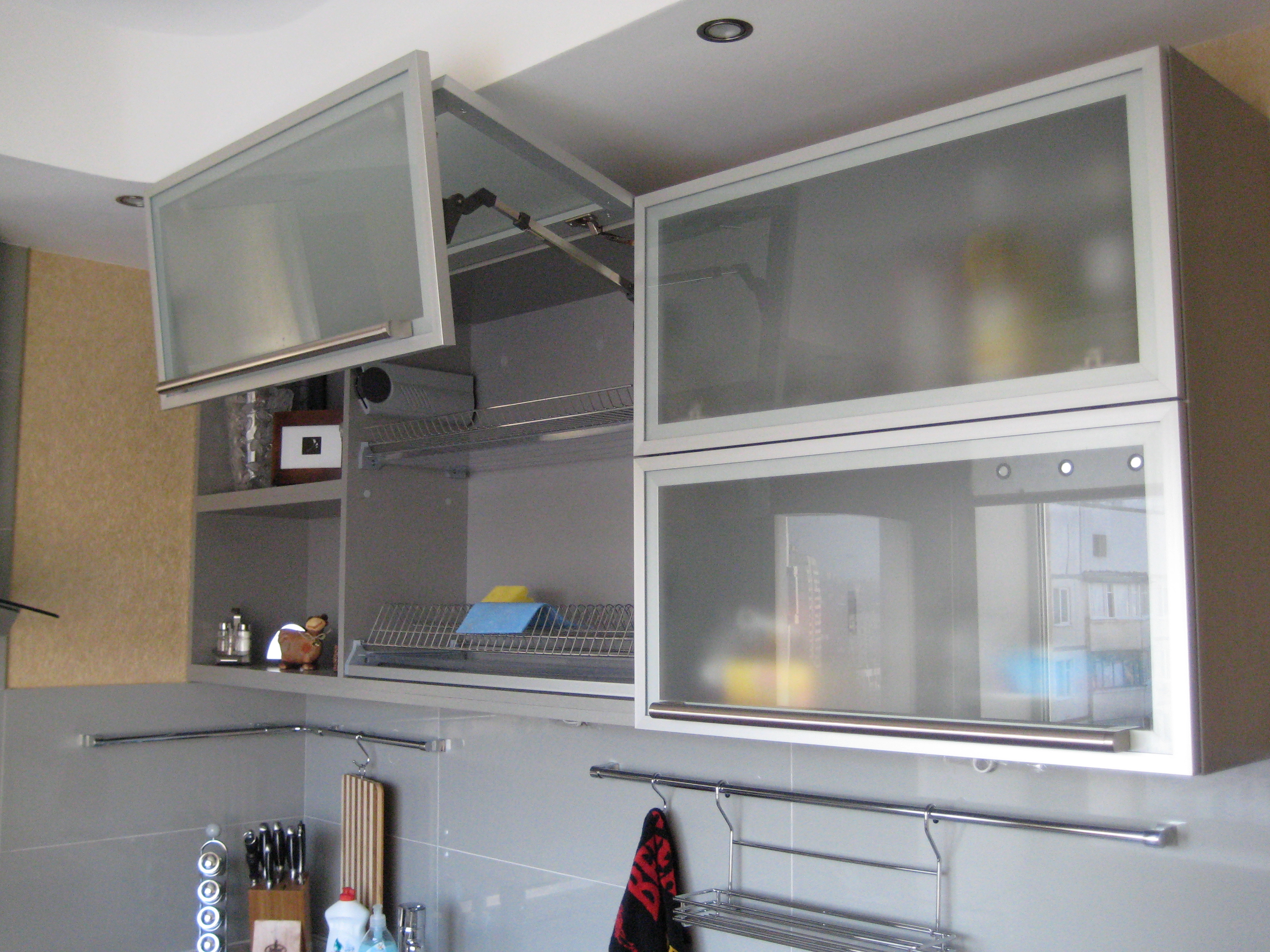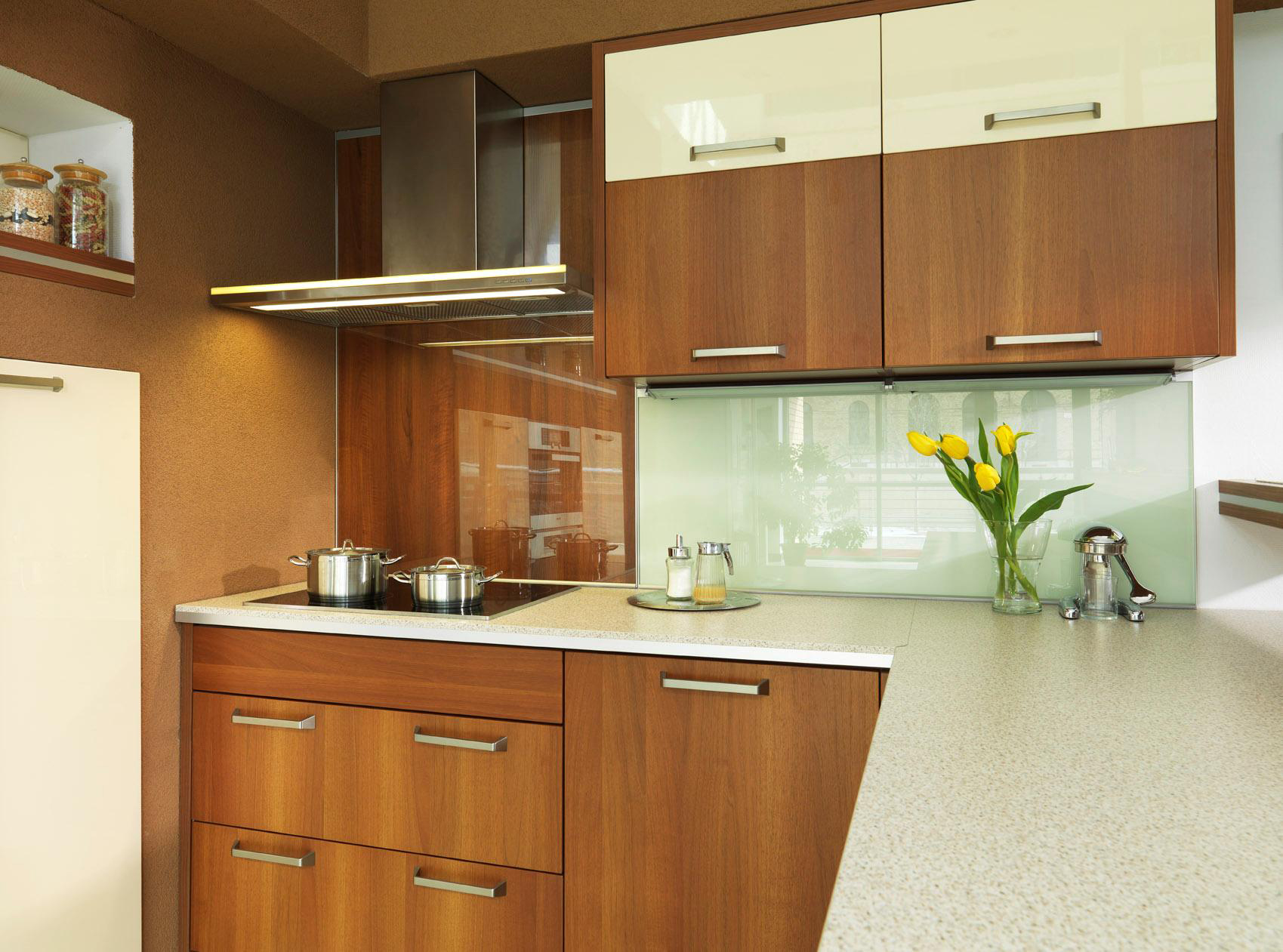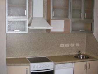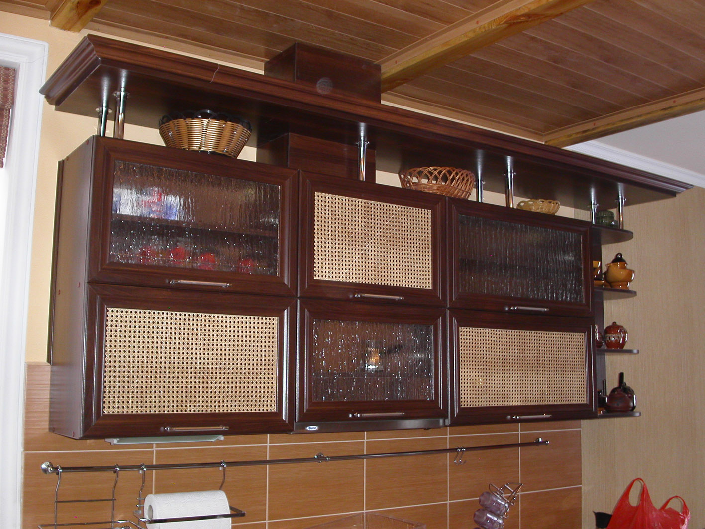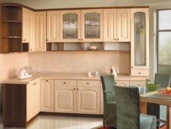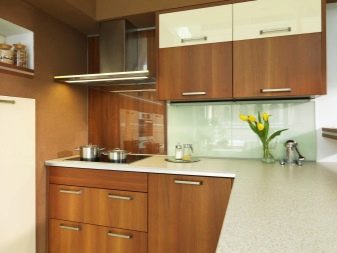 Dieses Rohmaterial hat fast keine sichtbaren Fehler. Es ist weder durch Dampf noch durch Wasser verformt, hat keine Angst vor hohen Temperaturen, ist nicht zerkratzt und leicht zu reinigen.Schränke mit solchen Fassaden wirken leicht und die Küche selbst - luftig. Glas für Fassaden als eigenständiges Material wird selten verwendet. Häufiger wird es als Einlage in Rahmenfassaden verwendet.