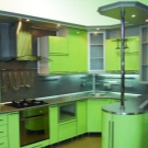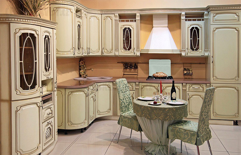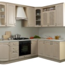 Eine Besonderheit der Wand-Eckschränke für die Küche ist ihre ungewöhnliche und sehr geräumige "Füllung" in Form von tiefen dreieckigen Regalen, Roll-out-Systemen oder um ihre Achse schwenkbaren Regalen, die freien Zugang zu den dort aufbewahrten Lebensmittelläden und Küchengeräten bietet.