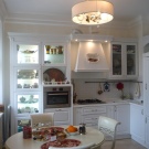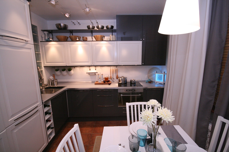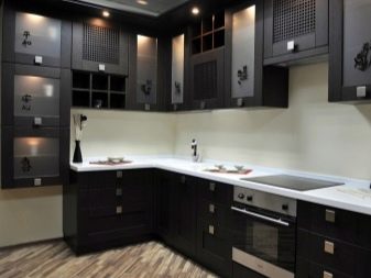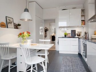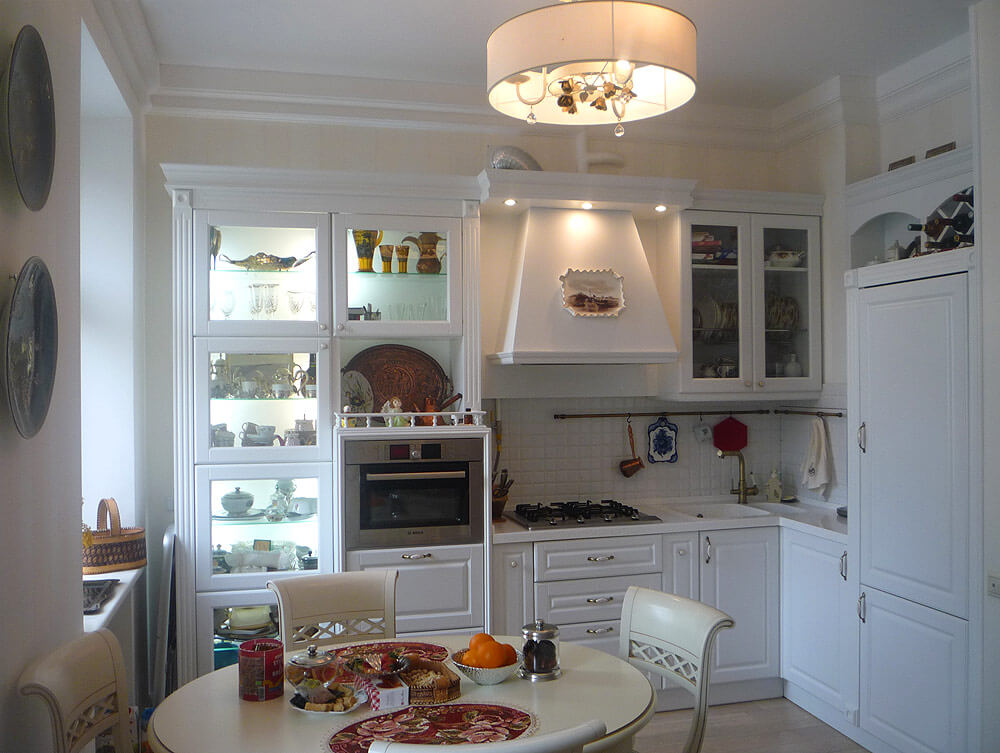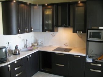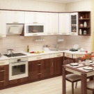 Denken Sie daran, dass die Einrichtung der Küche mit dunklen Schränken notwendigerweise zusätzliche Beleuchtung des Raumes erfordert, damit Sie nicht verlieren, wenn auch visuell, seine Geräumigkeit. Und weiße Wandschränke in der Küche kommen mit ihrer Standard-Kompaktheit und natürlichem Tageslicht friedlich miteinander aus.