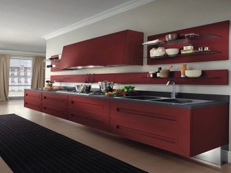 Die vorteilhafteste hängende Küche mit Unterschränken, die über dem Boden schwebt, wird in einem geräumigen Raum aussehen, weil Sie diese Schönheit nur aus der Entfernung angemessen schätzen können. Aber die unzweifelhaften Vorteile der Reinigung unter den hängenden unteren Schränken eines solchen Küchenbereichs und eine bequeme Position der Beine während des Kochens werden sofort universelle Anerkennung erhalten.