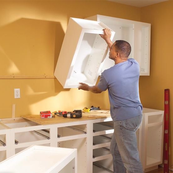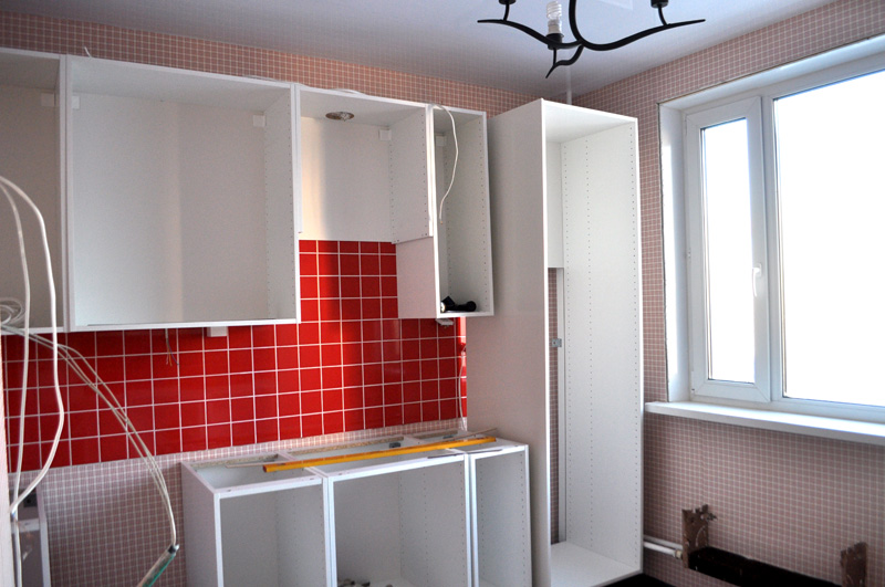 Wenn Sie zuerst alle Kisten ohne Türen montieren und an der Wand hängen, dann wird es einfacher sein, die Fassaden aufzuhängen und die Schlaufe anzupassen. Darüber hinaus bietet eine solche Montage und Installation eine Möglichkeit, die Lücken zwischen den Schränken zu kontrollieren, und wenn Sie immer noch Fehler in den Berechnungen machen, dann entfernen Sie das Gehäuse ohne eine Fassade ist viel einfacher als vollständig montiert.