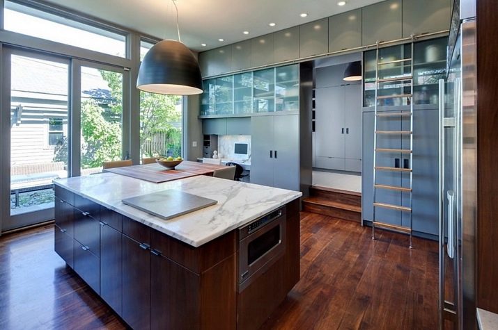 Im übrigen kann die ideale Küche in der Schwebe sein, nicht nur die oberen Schränke, sondern auch niedriger. Außen Sockel in einem gewissen Abstand vom Boden an die Wand befestigt, und sogar von unter der LED-Band beleuchtet wird, die Wirkung des in den Luft schwebenden Kücheneinheiten erstellen. Und auch hier ist sehr wichtig, zuverlässige Befestigung der unteren Hängeschränke auf einem stabilen Rahmen mit Hilfe von hochwertigen Markisen und Ankerschrauben. Auch in den suspendierten Bodendosen in der Regel bekommt die meisten massiven Utensilien und Küchengeräte, obwohl eine solche Schließfach und er wiegt viel, und immer noch müssen nicht das Gewicht all dessen, was halten wird darin auf Halde.