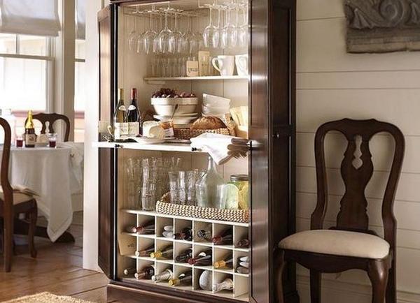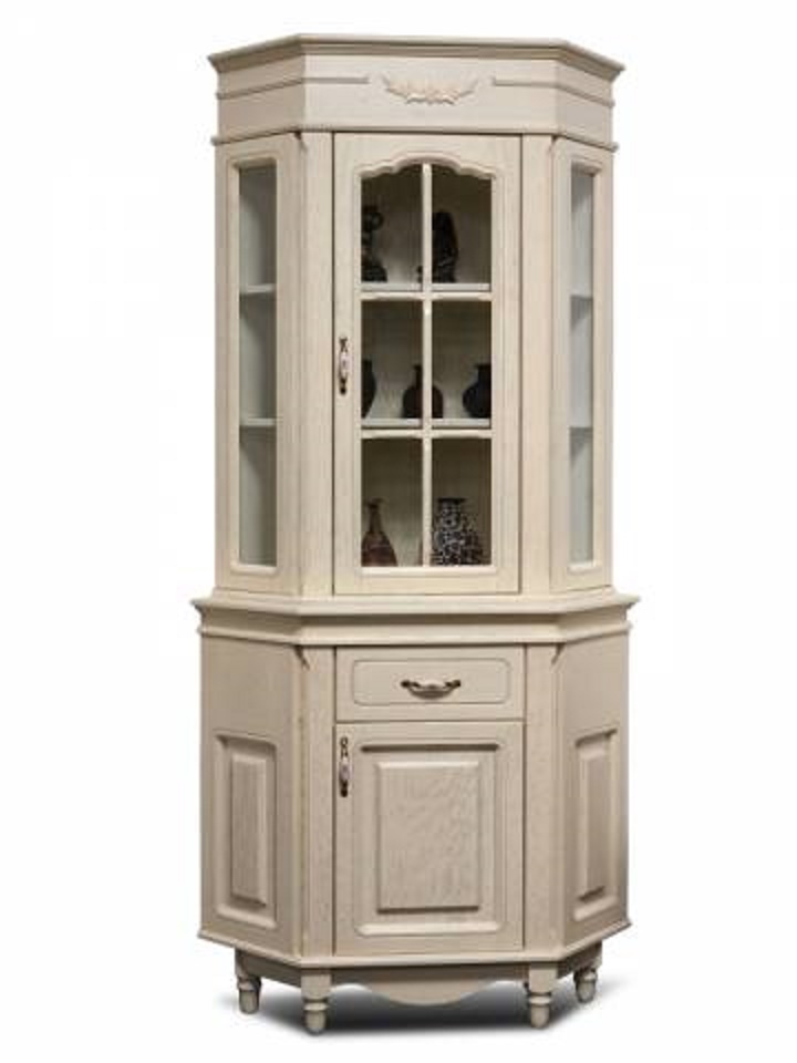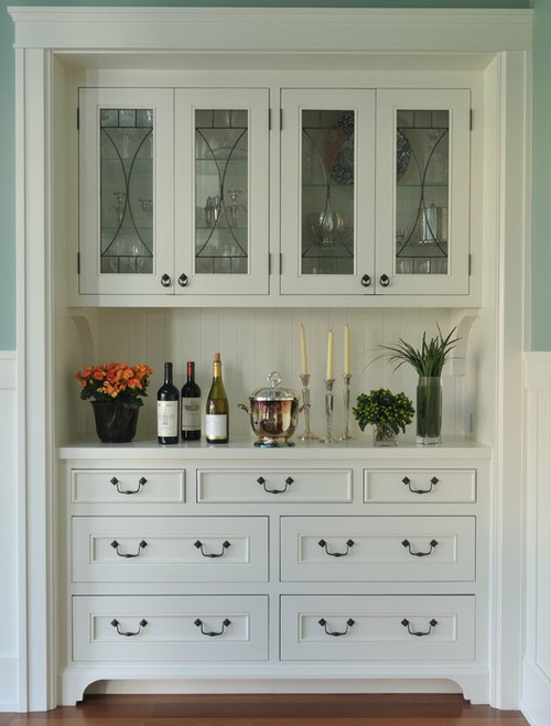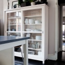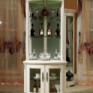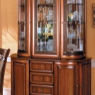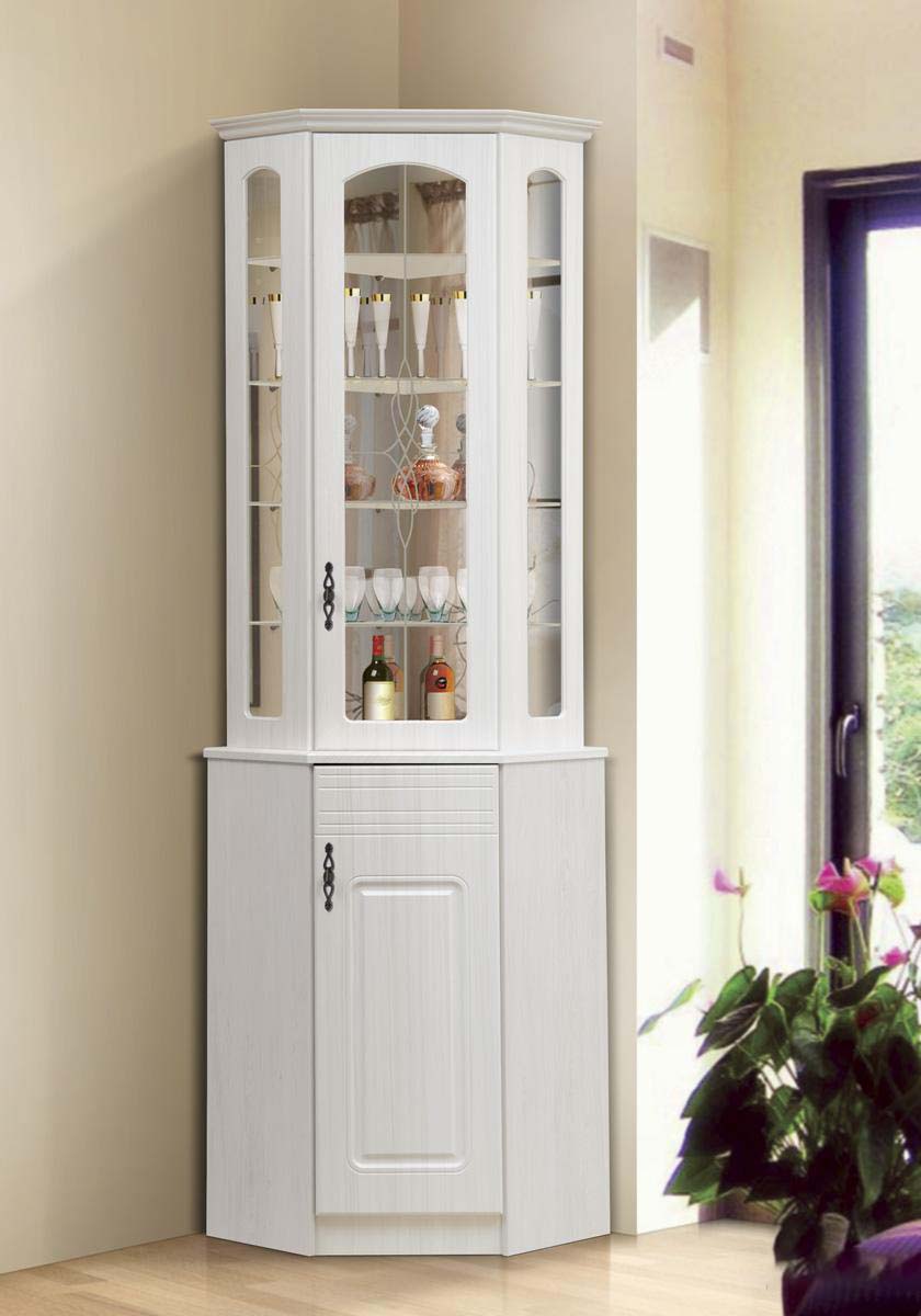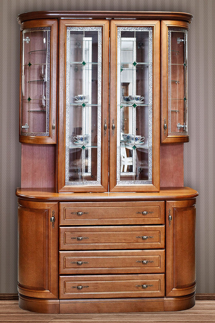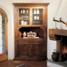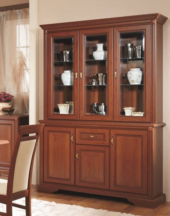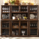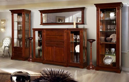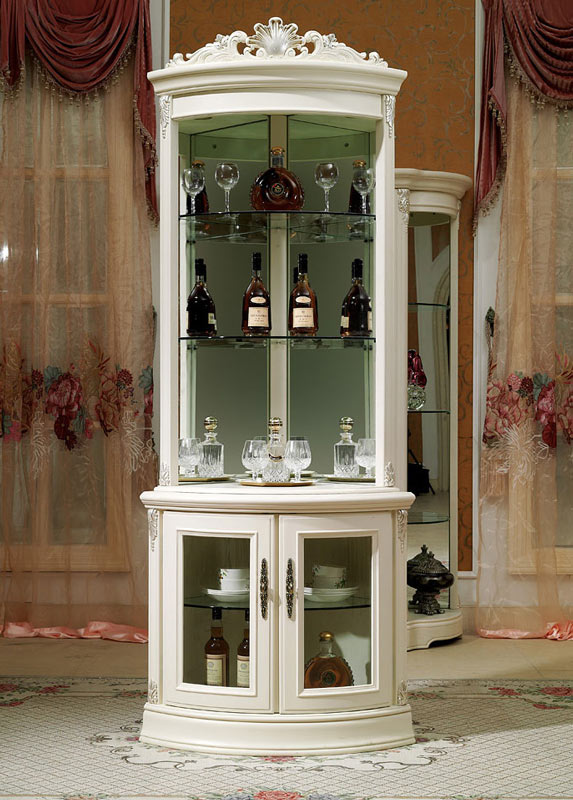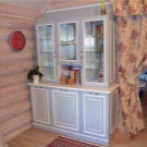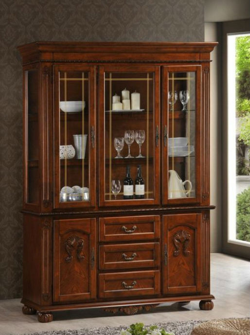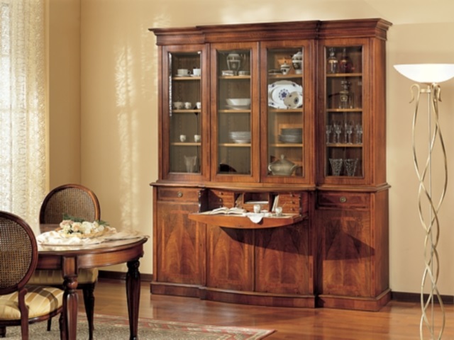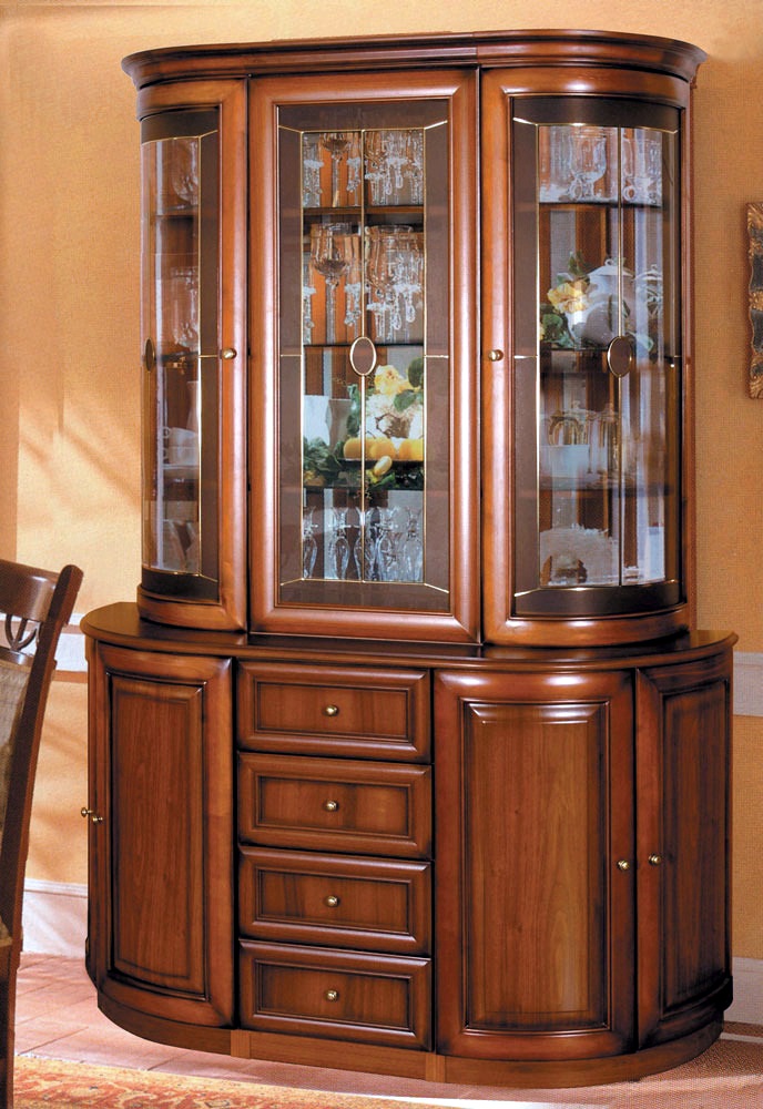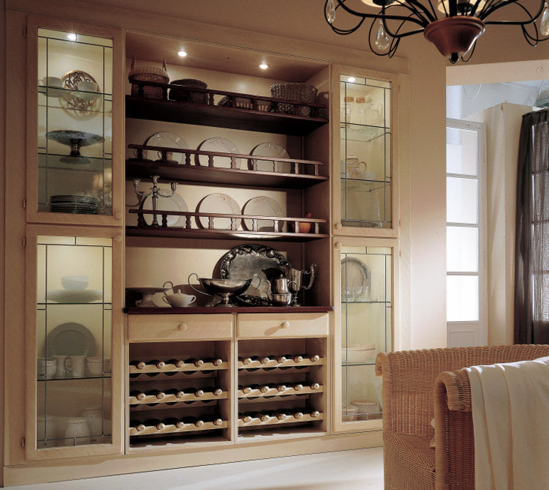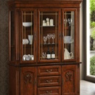 Dies ist ein Bodenschrank mit transparenten Glastüren. Solch ein Schrank sollte am sichtbarsten Platz sein. Er fragt in der geräumigen Küche oder im Gäste-Esszimmer. Es kann sowohl hoch als auch klein sein.