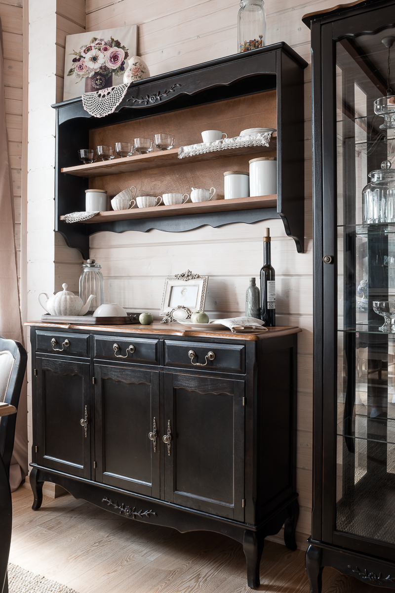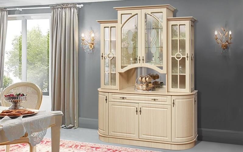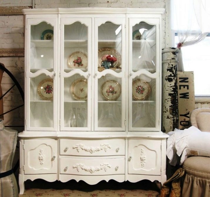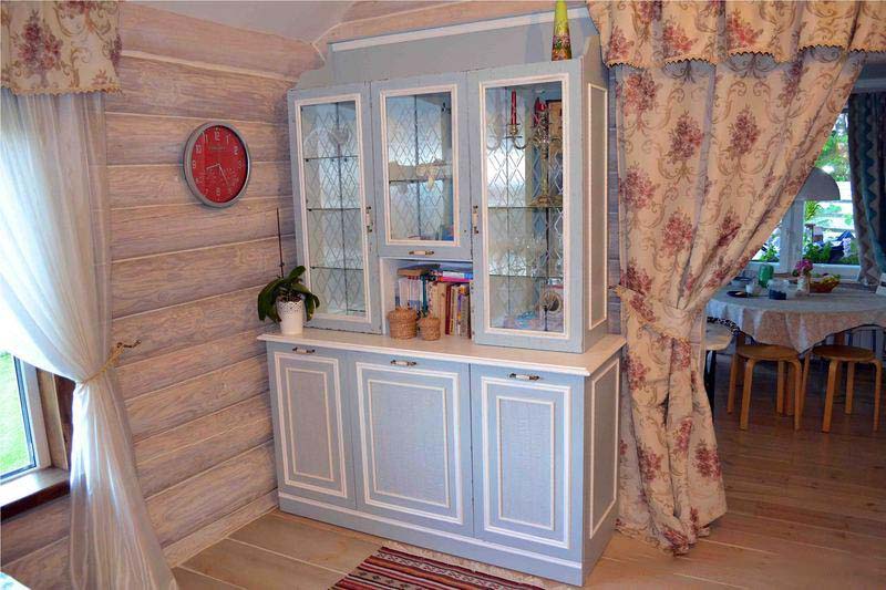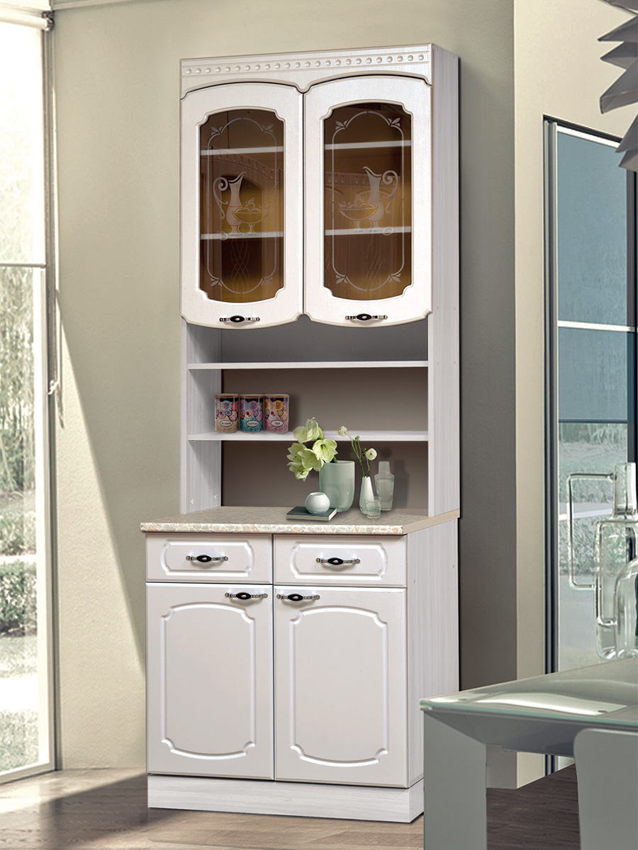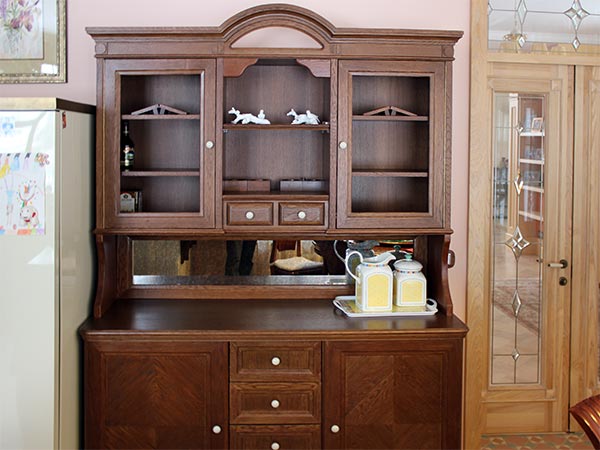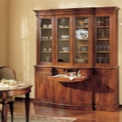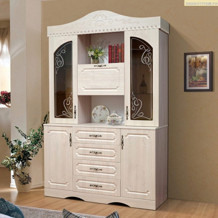 Es kommt vor, dass die Vitrine im oberen Teil komplett offen ist. Oder hat die Tür nicht auch den unteren Teil. Es eignet sich für große Krüge, Geschirr, Geschirr.Darüber hinaus kann das Buffet eine Arbeitsfläche haben, auf der die Gastgeberin Essen zubereiten wird.