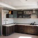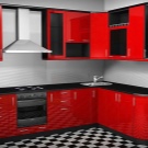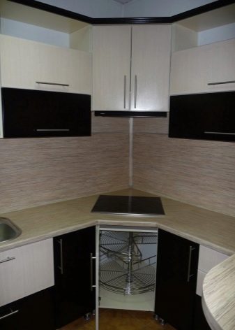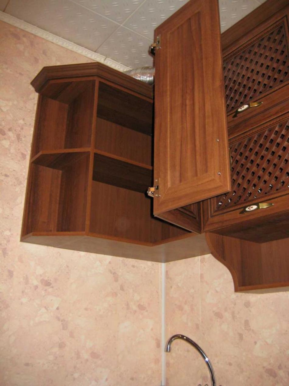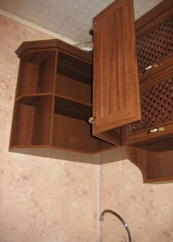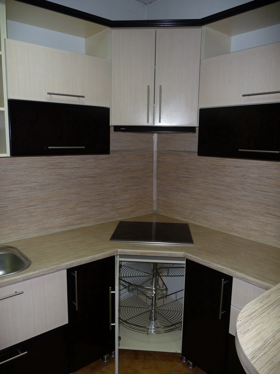 - Die innere Füllung der Eckmodule ist eine rein individuelle Angelegenheit; Um den unteren Schrank funktioneller zu gestalten, sollte man die trapezförmige Form wählen, übrigens ist der obere Schrank im "Trapez" -Format auch funktioneller, aber wahrscheinlich nicht zum Aufbewahren von Geschirr geeignet.