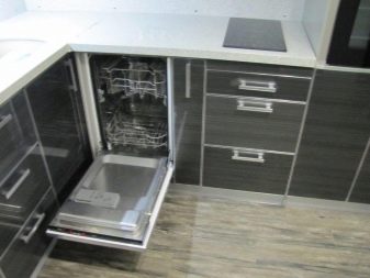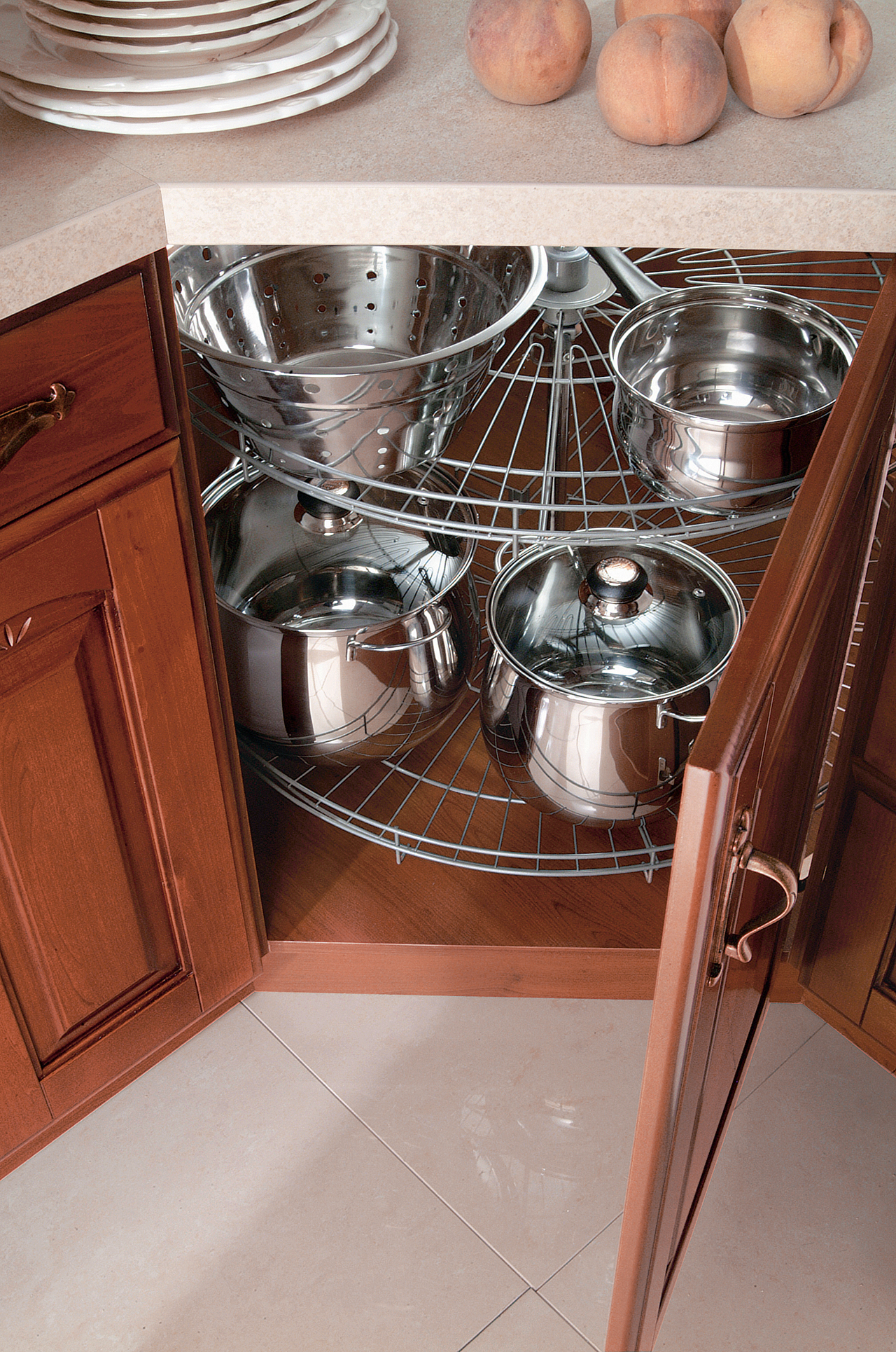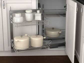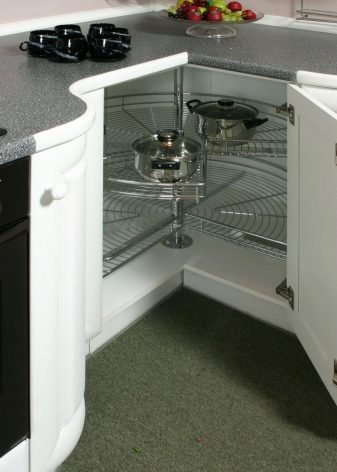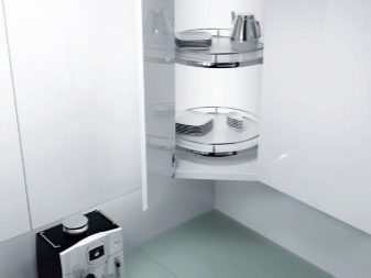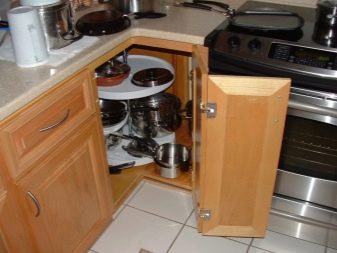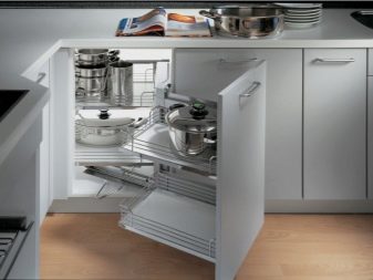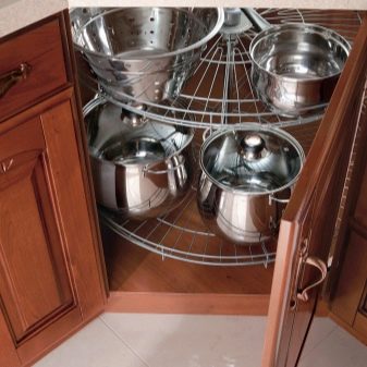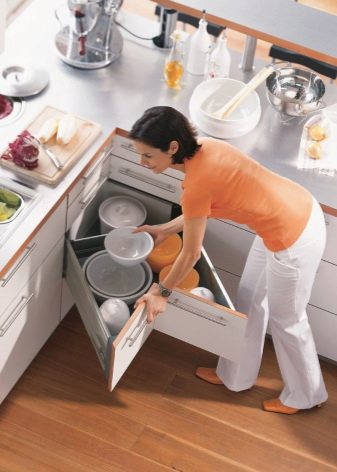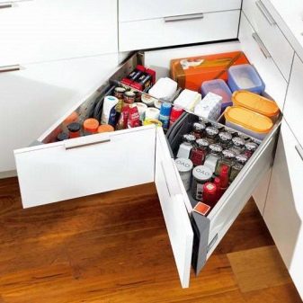 Je nach Konfiguration legen sie Geschirr, Küchenutensilien, Lebensmittel und sogar Kleingeräte in Eckschränke der oberen Etage. Die unteren Module mit eckiger Form werden oft für Haushaltszwecke verwendet, aber die erfahrensten Handwerker machen diesen unzugänglichen Bereich zu einer Nische für Geräte wie eine Geschirrspülmaschine oder eine Waschmaschine.