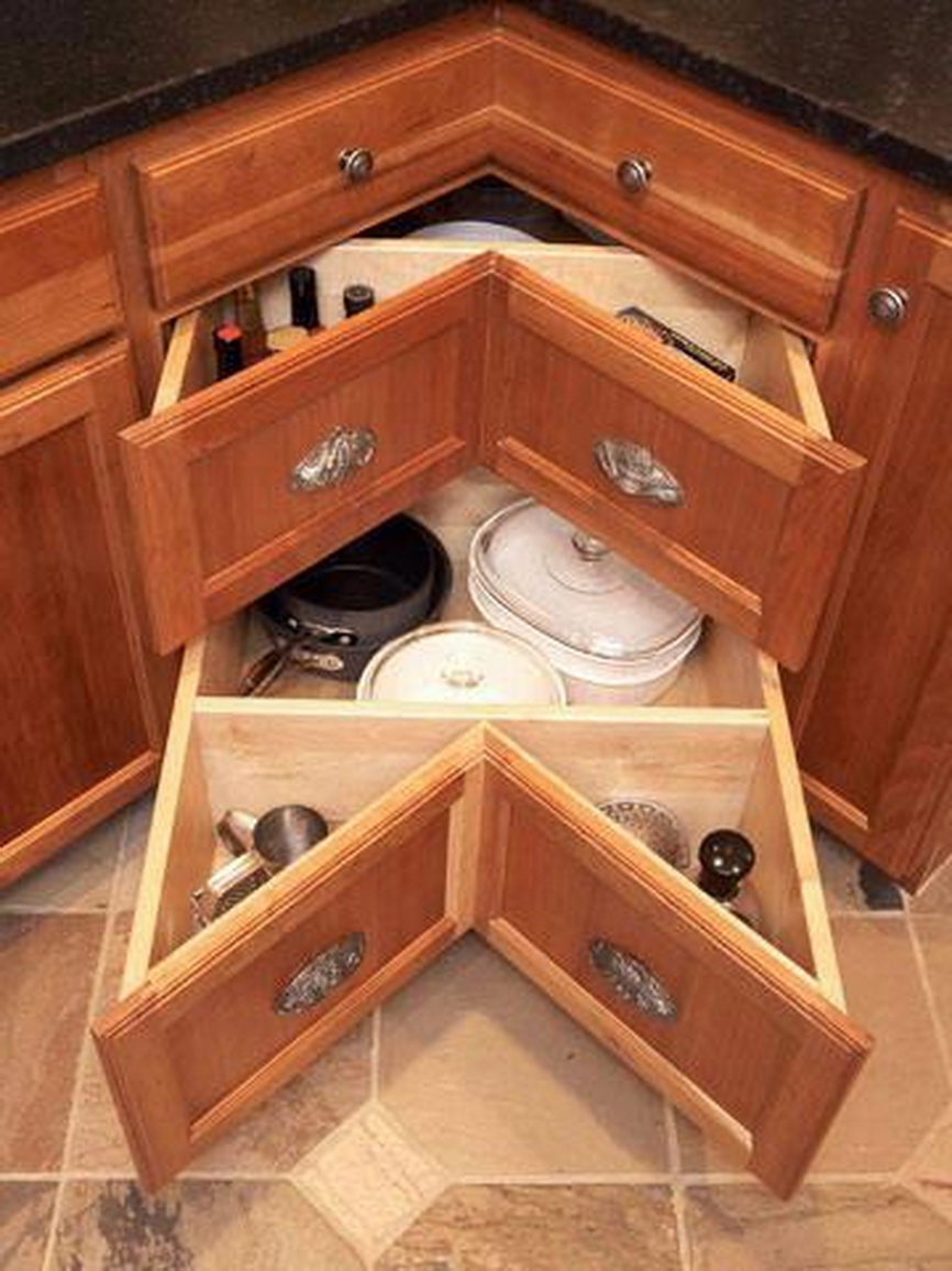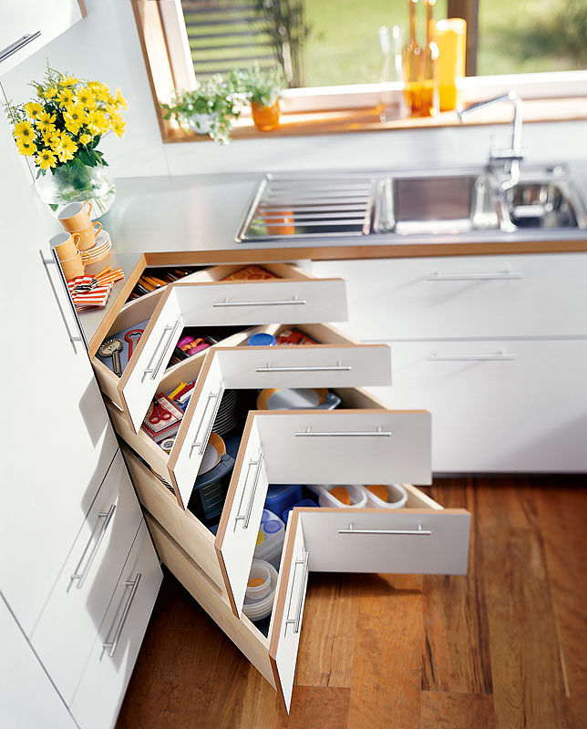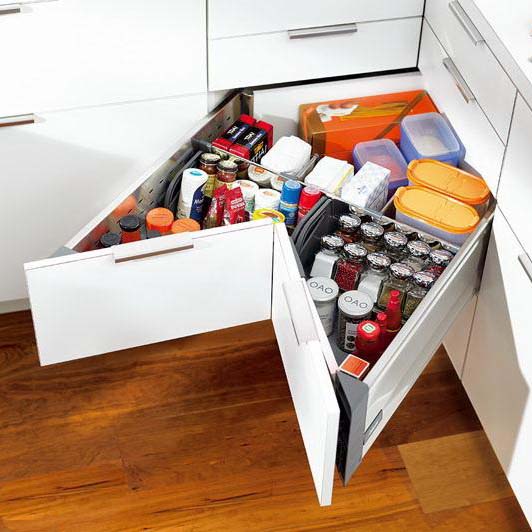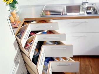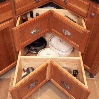 - Funktionelle Garderobe mit Schubladen - eine ausgezeichnete Option, aber teuer. Schrank-Trapez eignet sich gut für die Aufbewahrung von Küchenutensilien und Gewürzen durch die Füllung einziehbar Design mit geräumigen Regalen.Die einfachste Möglichkeit wäre, einfache Schubladen in einen trapezförmigen Schrank zu stellen.