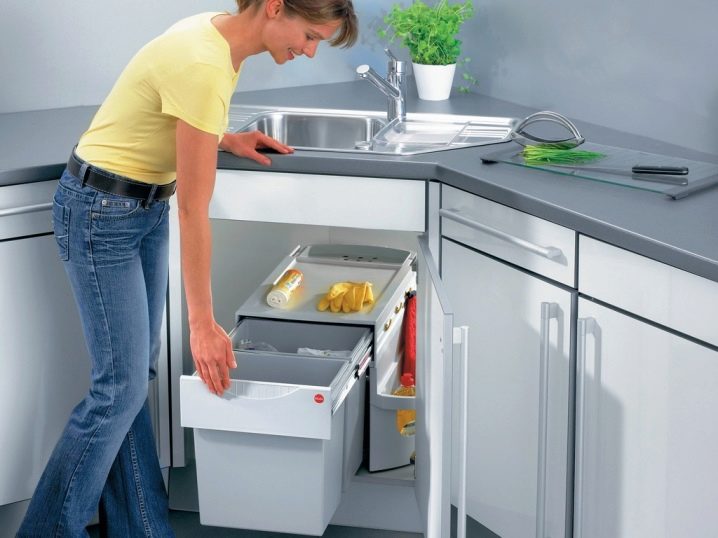- Es ist Küchenspüle installiert, so dass der Boden eines ähnlichen Designs oft nur für die Lagerung der Mülleimer und anderes Haushaltszubehör verwendet wird. Tatsache ist, dass der Hauptplatz im unteren Schrank von der Pipeline eingenommen wird und wenig Raum für Fantasie lässt.