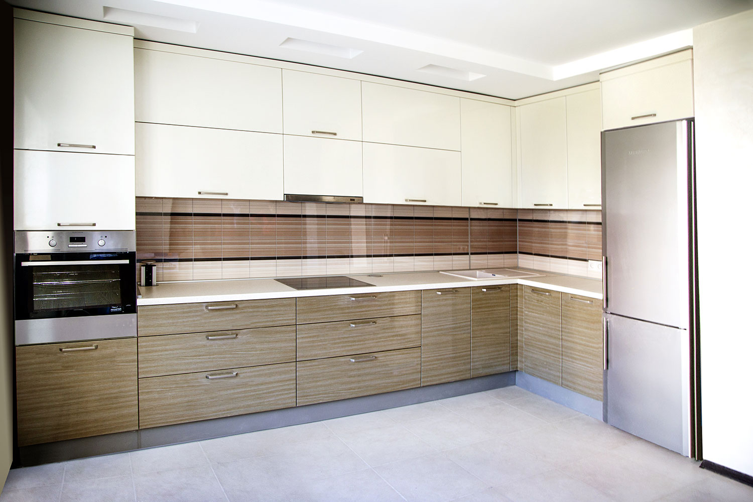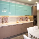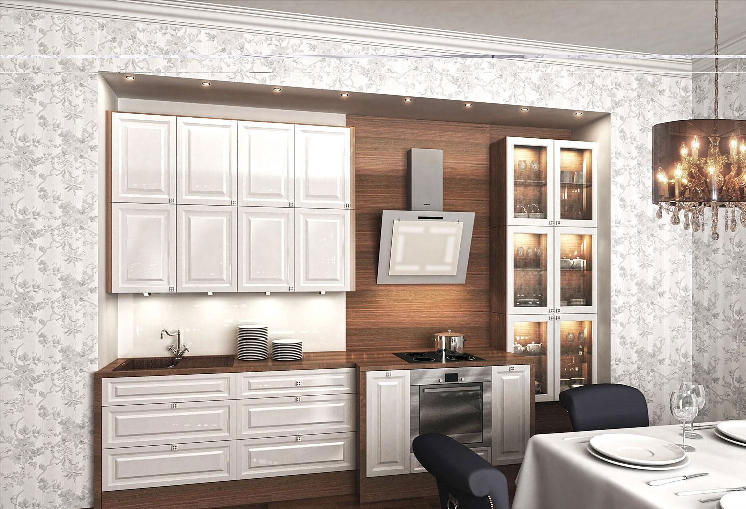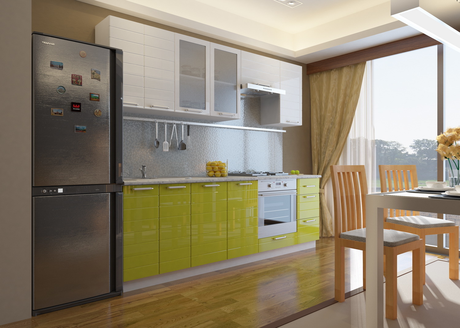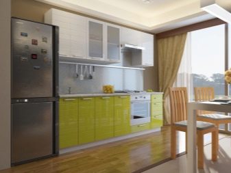 Vor allem, achten Sie auf den Kühlschrank. Wenn es eine geringe Höhe hat, kann ein kleiner Klappschrank perfekt darüber passen. Wenn unser Kühlaggregat eine Größe von 2 Metern und mehr hat, ist es ratsam, die obere Reihe der Schränke entsprechend der Höhe des Kühlschranks aufzuhängen.