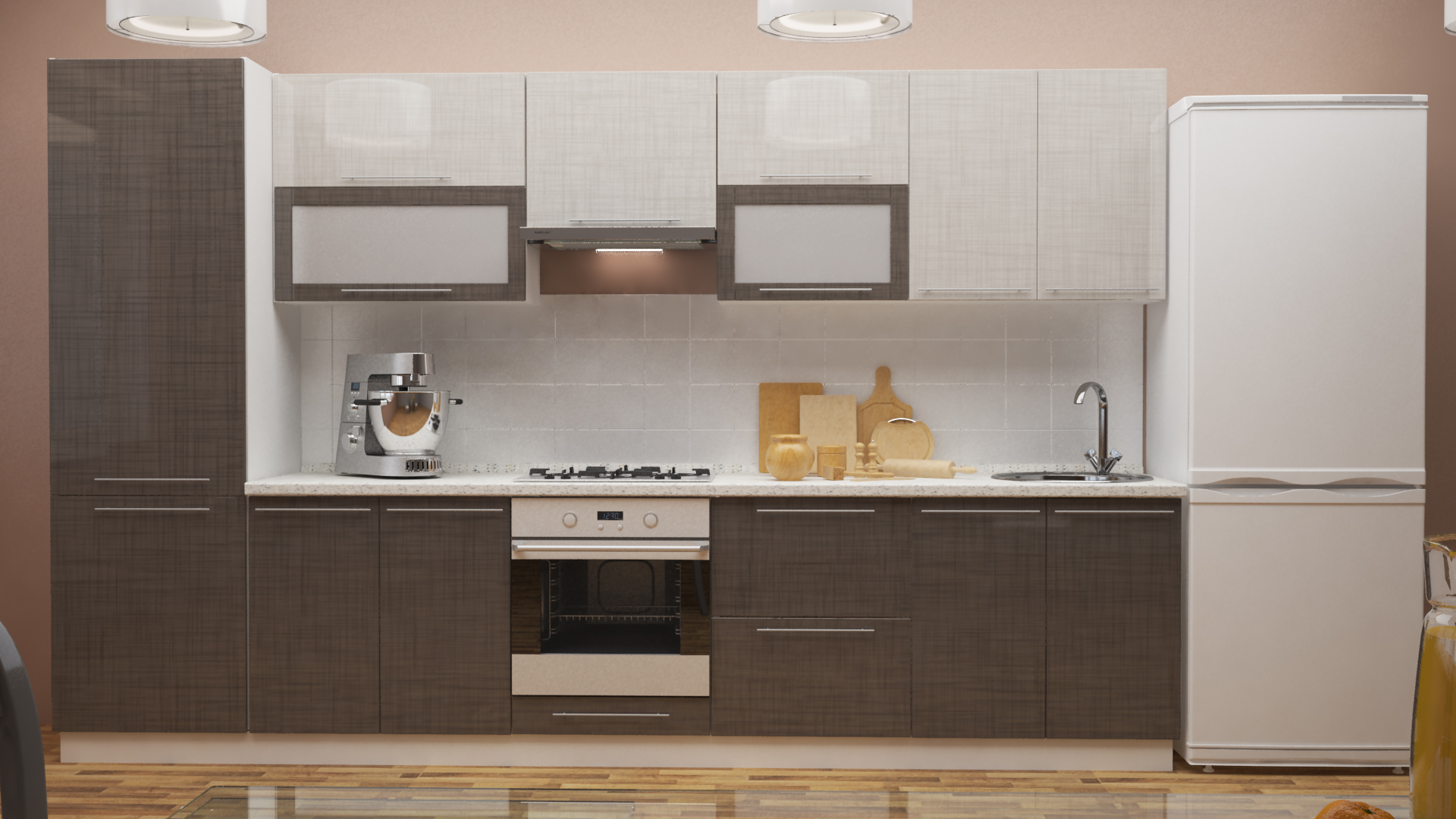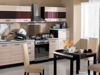 Ästhetisch sollten alle Schränke im Raum miteinander harmonieren, auch wenn sie separat ausgewählt und gekauft wurden. Die ideale Option ist der Kauf einer Kücheneinheit, in der alle Module zum Teilen freigegeben sind.