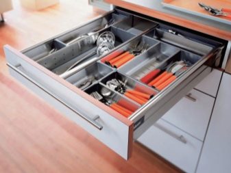 Neben den Schubladen gibt es auch Schiebe-Strukturen, die Metaboxen genannt werden. Ein solches System besteht aus zwei Metallwänden mit Rollen und Führungen im oberen Teil und zwei Führungen an den Schrankwänden. Die Rückwand und der Boden bestehen aus laminierten Spanplatten, und die Vorderwände der Metaboxen müssen mit den Türen der benachbarten Schränke harmonieren.Da das Design dünne Wände hat, ist die Kapazität der Metabox größer als die einer normalen Box.