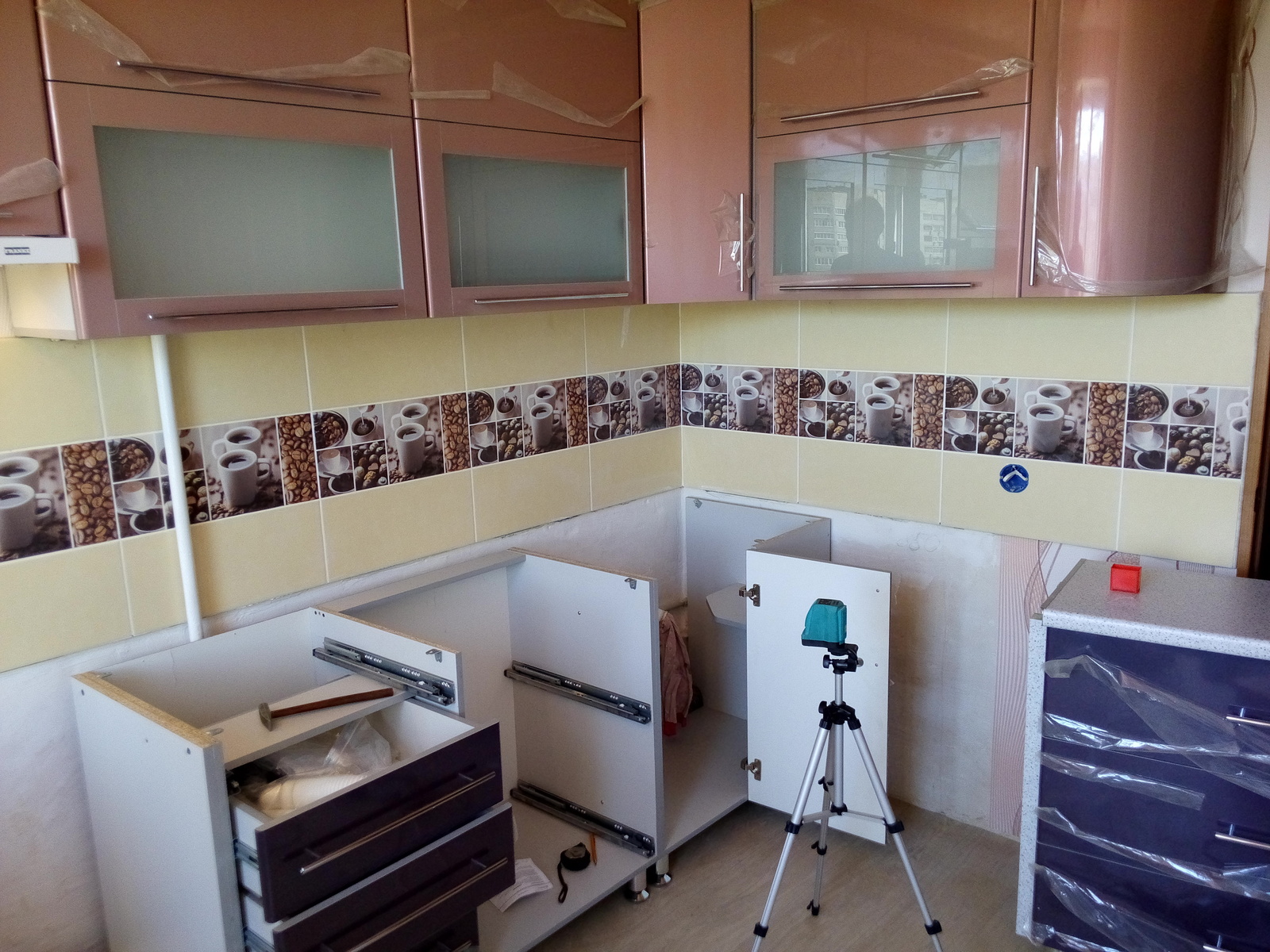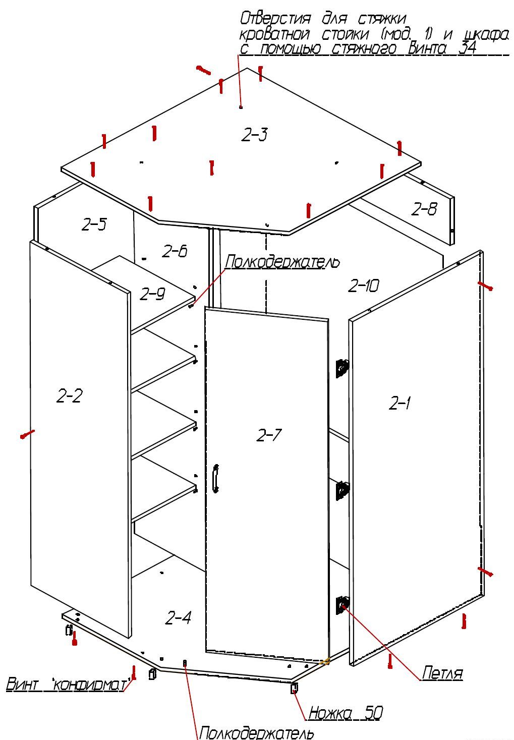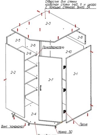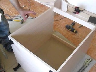 Wir beginnen mit der Montage der oberen Schränke, indem wir die Seitenwände an den unteren und oberen Teilen anbringen, dann befestigen wir die Rückwand und die Scharniere für die Installation an der Wand. Wir hängen die Tür zuletzt auf.Die Montage des Schrankes der unteren Ebene ist ähnlich, nur mit dem Unterschied, dass letztere die Arbeitsplatte installieren.