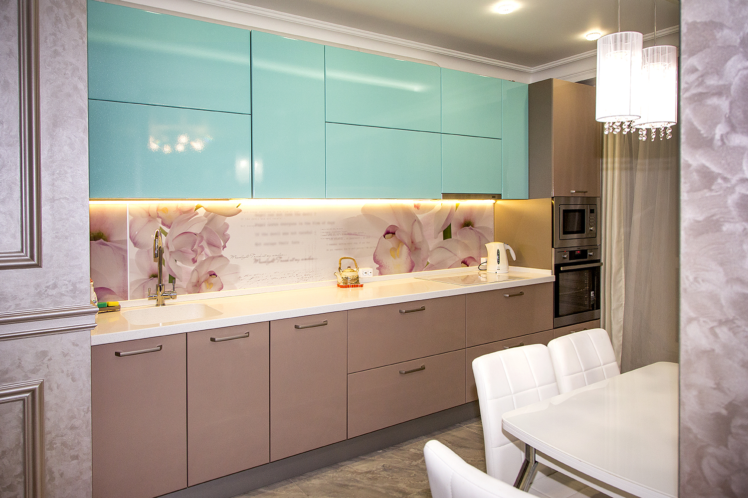 Beim Zusammenstellen einer Küche müssen Sie zwangsläufig auf einige wichtige Details achten.Die Position der Steckdosen und deren Anzahl sollte den sicheren Betrieb elektrischer Geräte gewährleisten, da es wünschenswert ist, sie ohne Verwendung von Verlängerungskabeln direkt mit der Steckdose zu verbinden. Der Arbeitsbereich sollte gut beleuchtet sein, um Unfälle beim Kochen zu vermeiden.